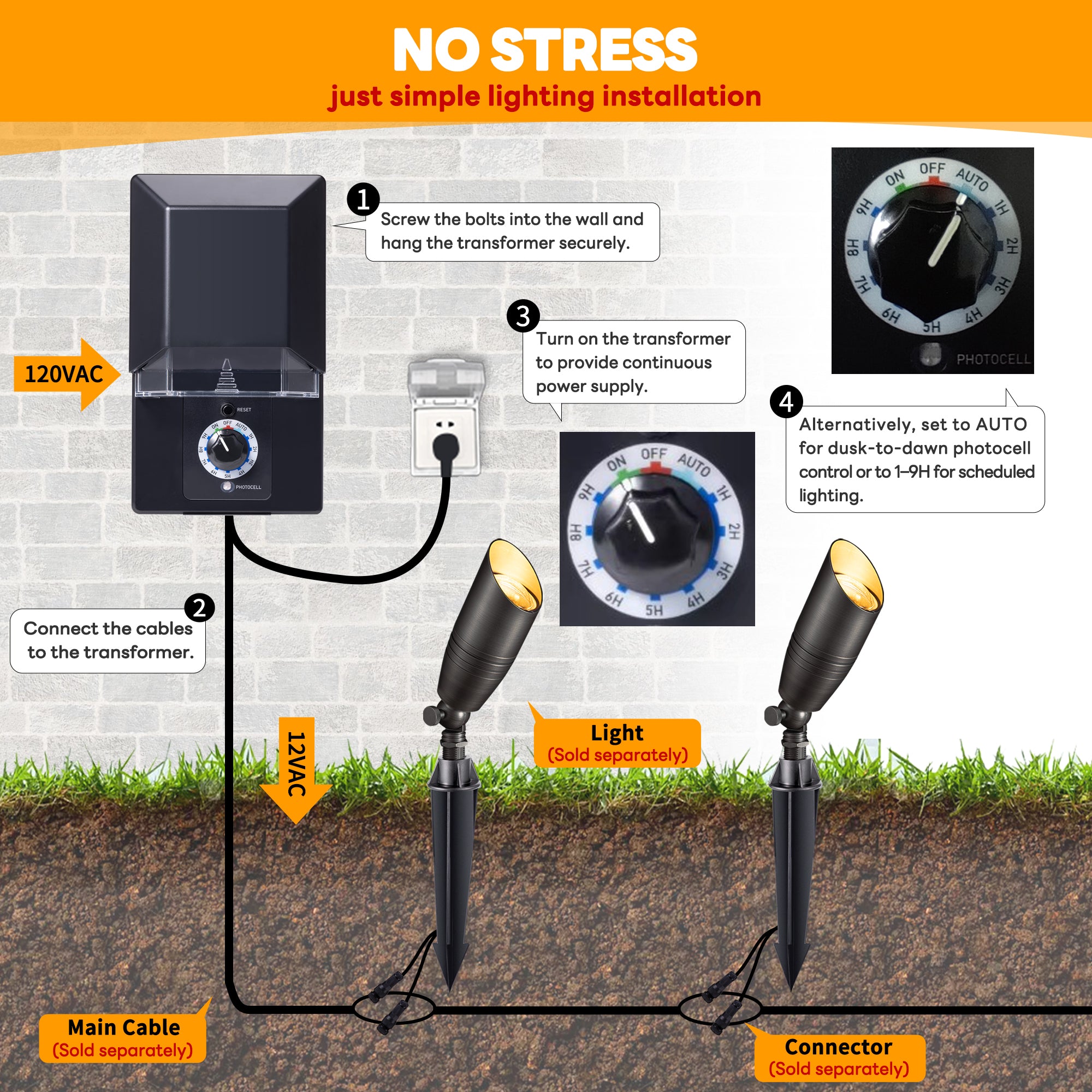 Use Low voltage landscape cable(not included)