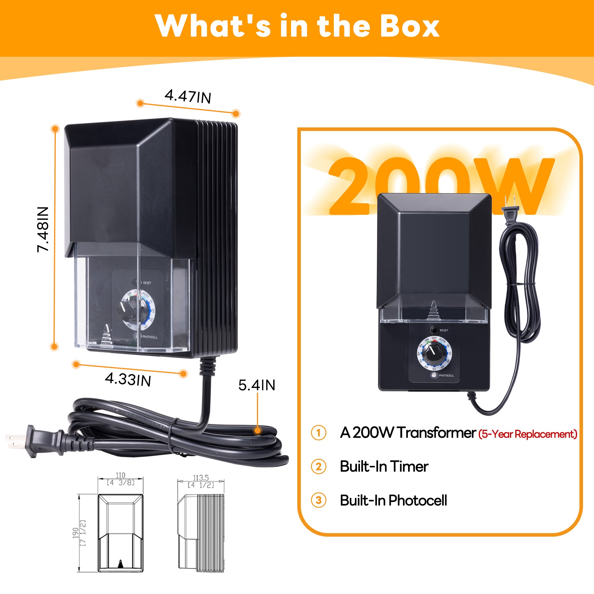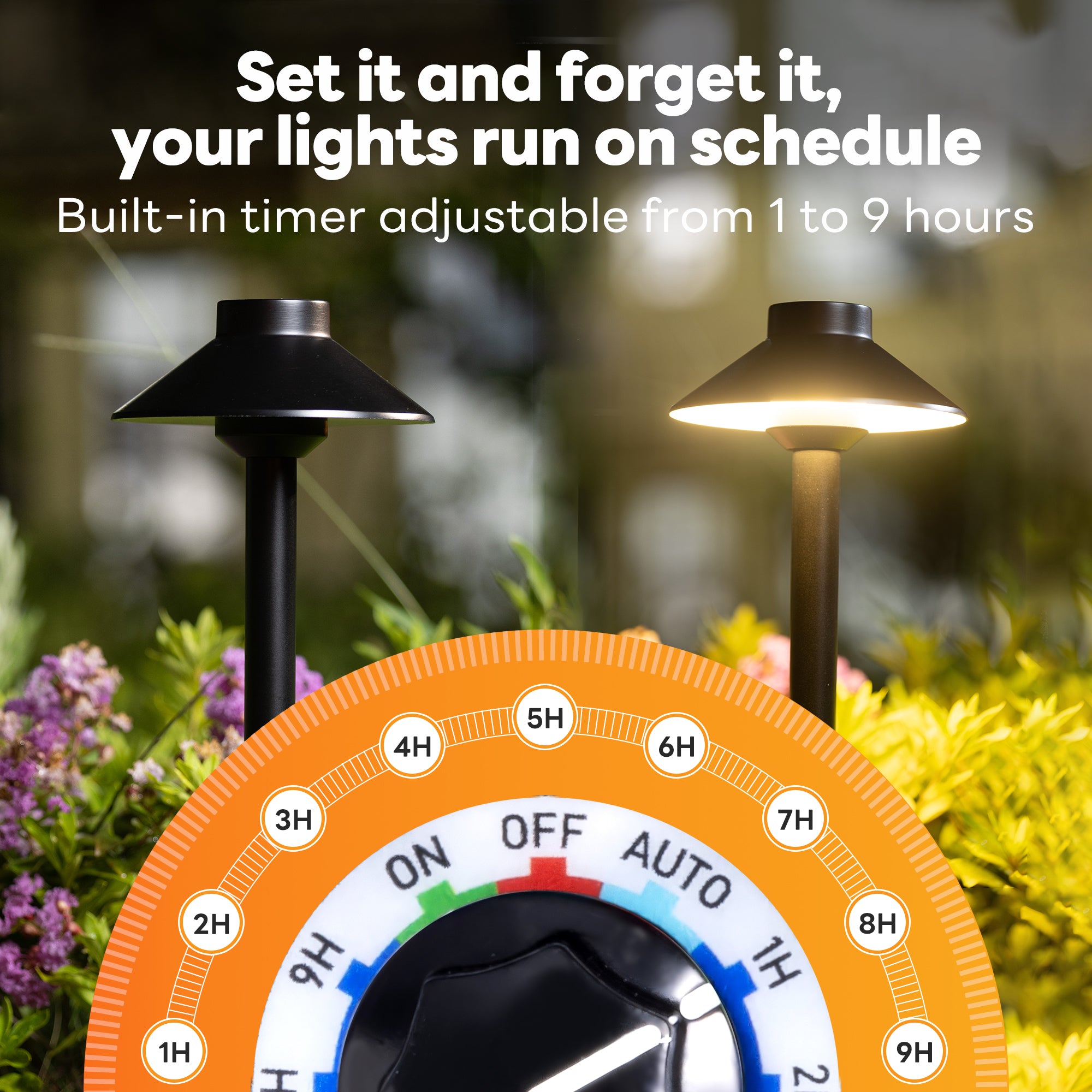 - SMART AUTOMATION-Let this smart transformer manage your outdoor lighting. Its photocell sensor automatically powers your landscape from dusk to dawn. Or, use the built-in 1-9 hour countdown timer for custom schedules and energy savings, giving you total control.