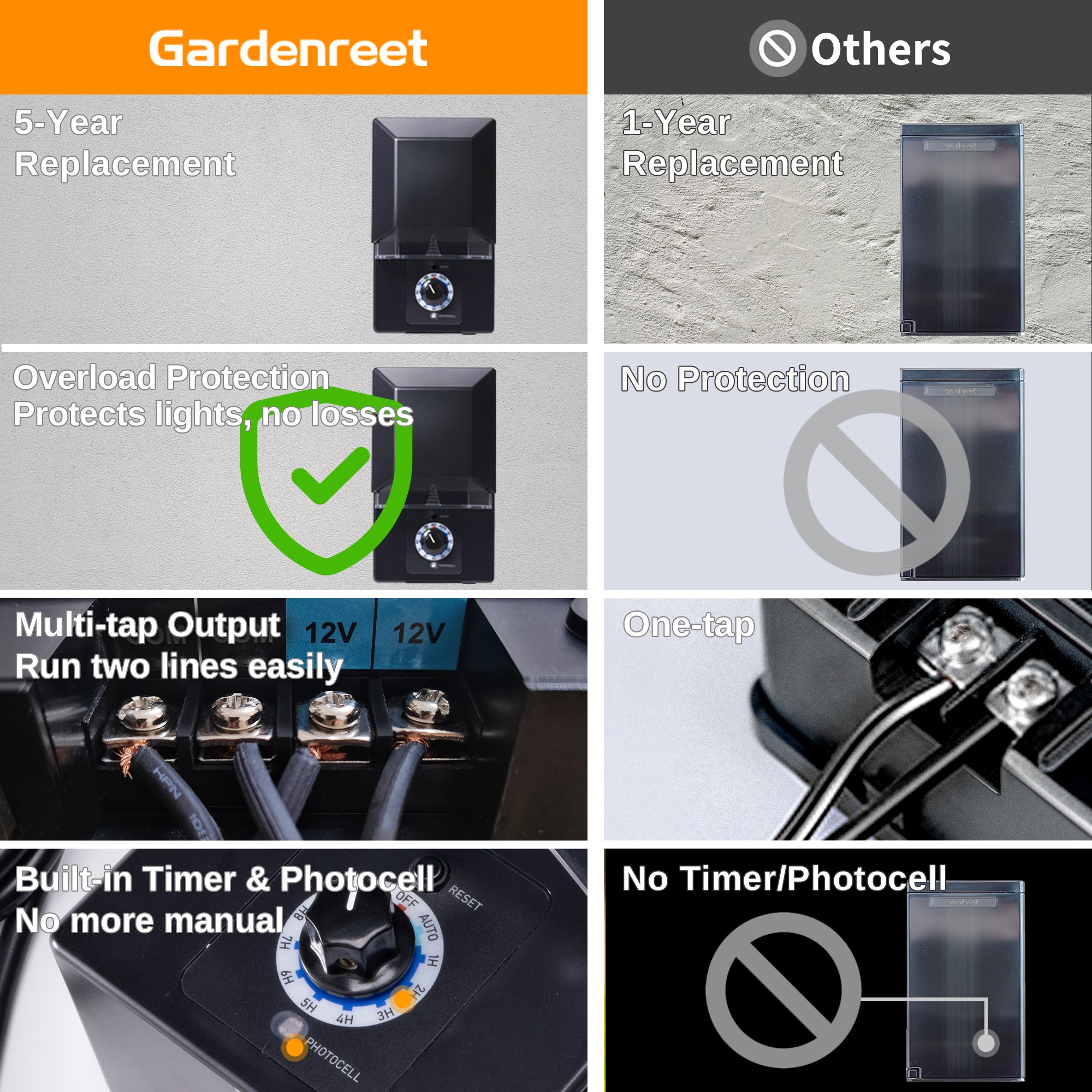 - BRIGHT & SAFE POWER-Say goodbye to dim lights. Our transformer’s dual 12V outputs provide consistent power for uniform brightness across your entire landscape lighting system. Crucially, built-in Overload Protection keeps your pathway lights and spotlights shining brilliantly and safely.