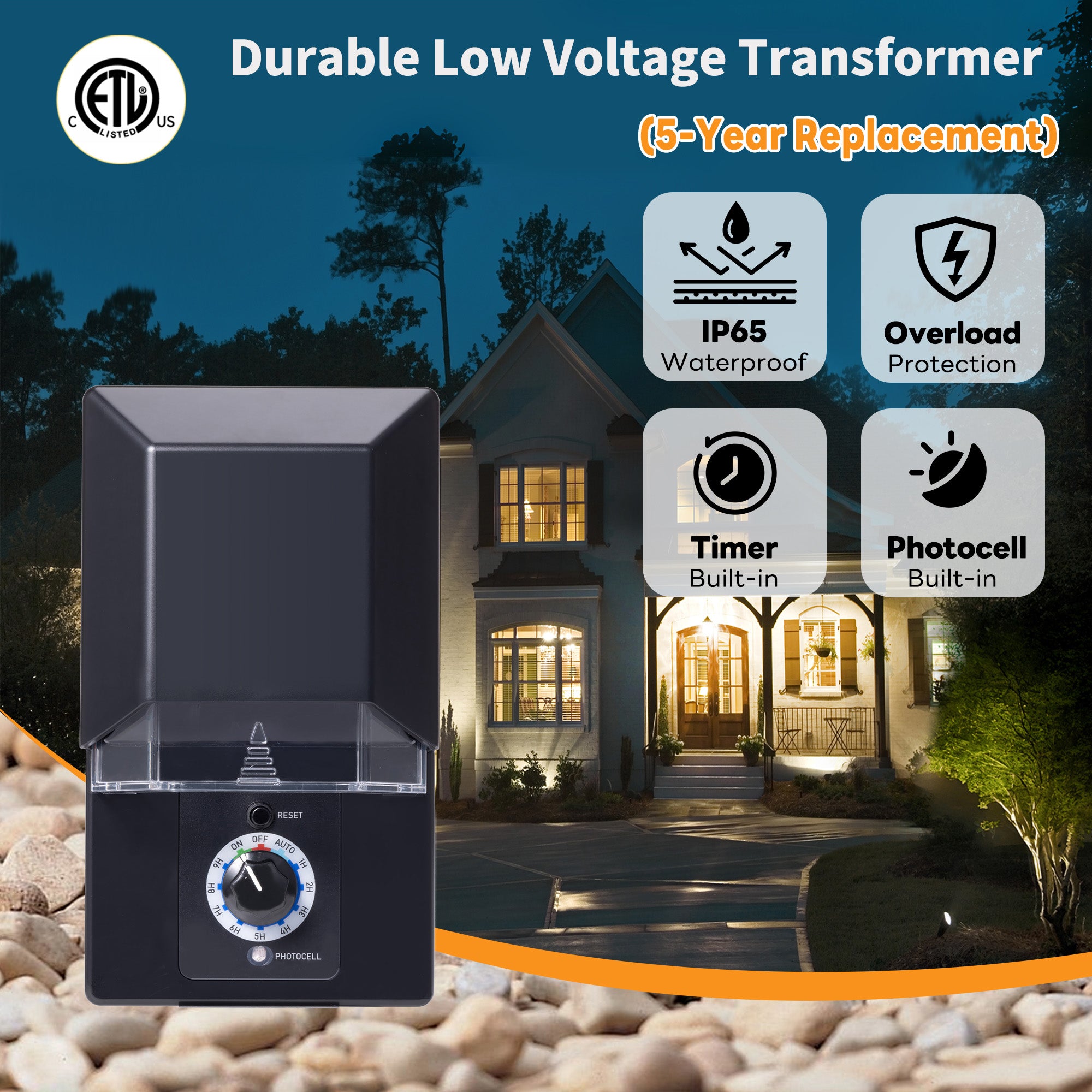 - 5-YEAR REPLACEMENT-Invest in quality with an industry-leading 5-Year Replacement Guarantee. This reliable power supply for your outdoor lighting project is built to last. Plus, you can try this low voltage landscape transformer for a full 60 days, completely risk-free.