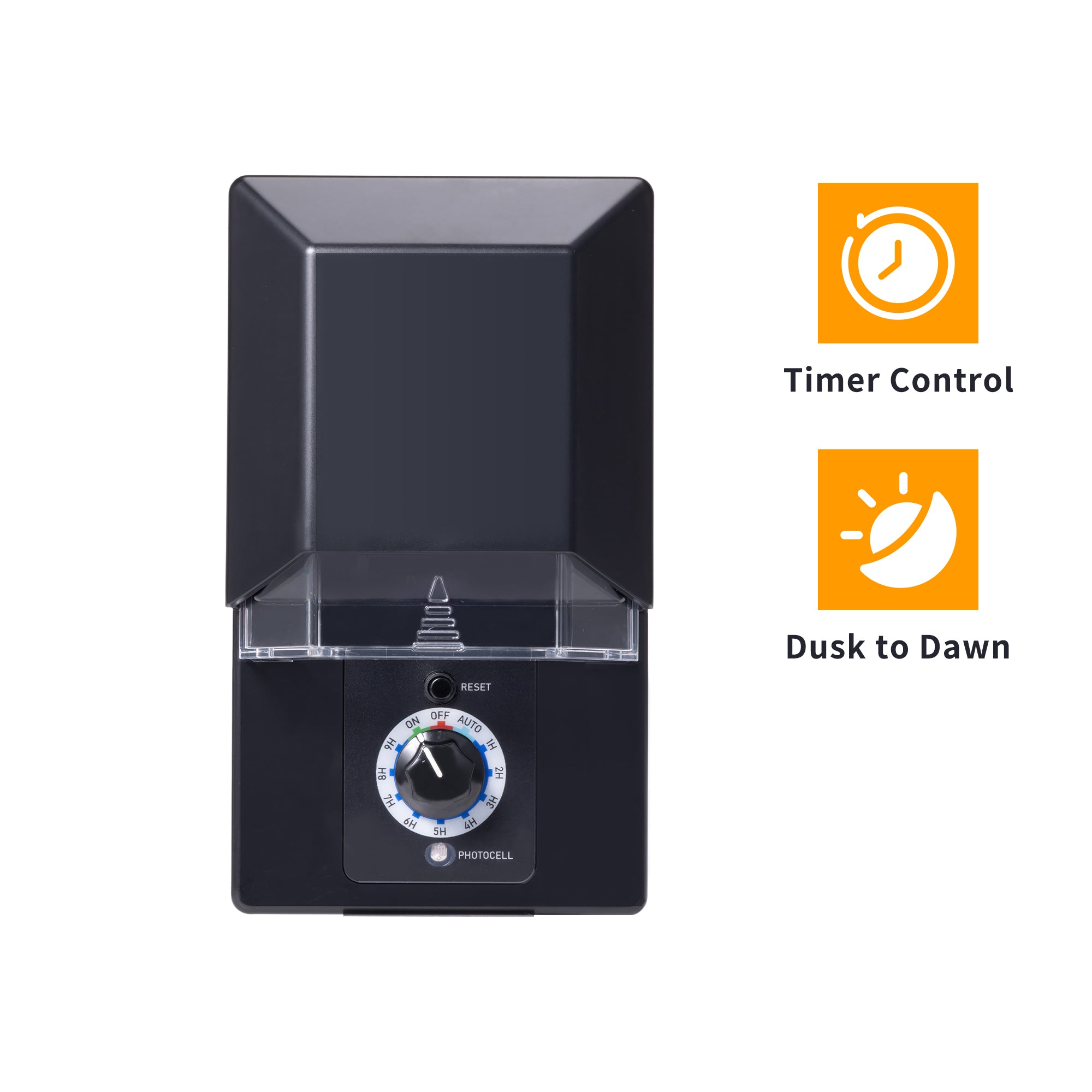 - Timer Options: 1–9 Hours, Dusk-to-Dawn, Always ON