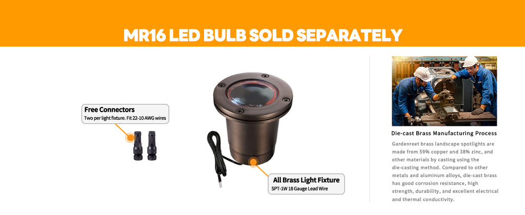 Our low voltage landscape in-ground lights accept LED and halogen MR16 bulbs with a GU5.3 socket, up to 50W.