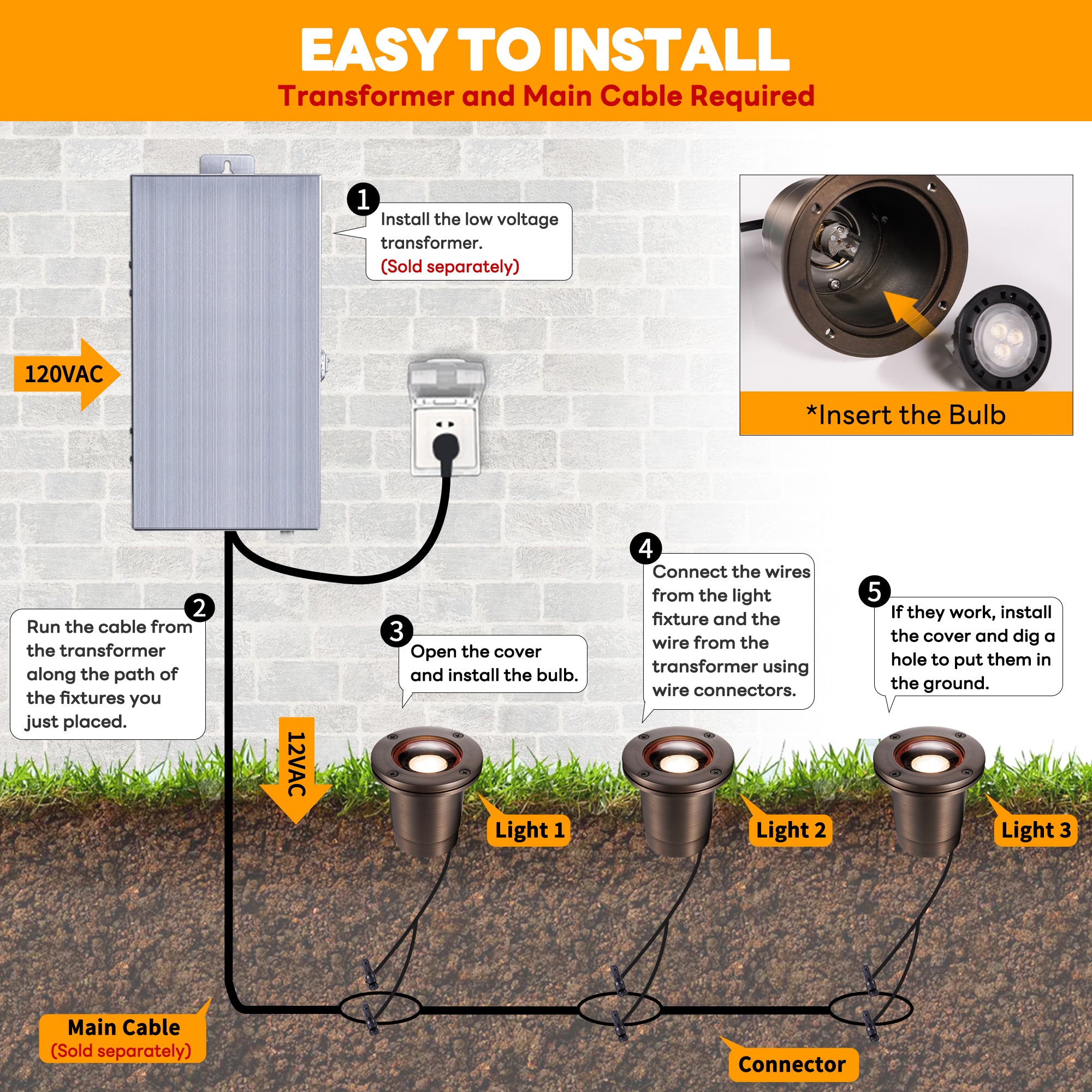 These in ground low voltage landscape lights need wiring to a low voltage transformer, sold separately, and are not plug-and-play. Compatible with most transformers.