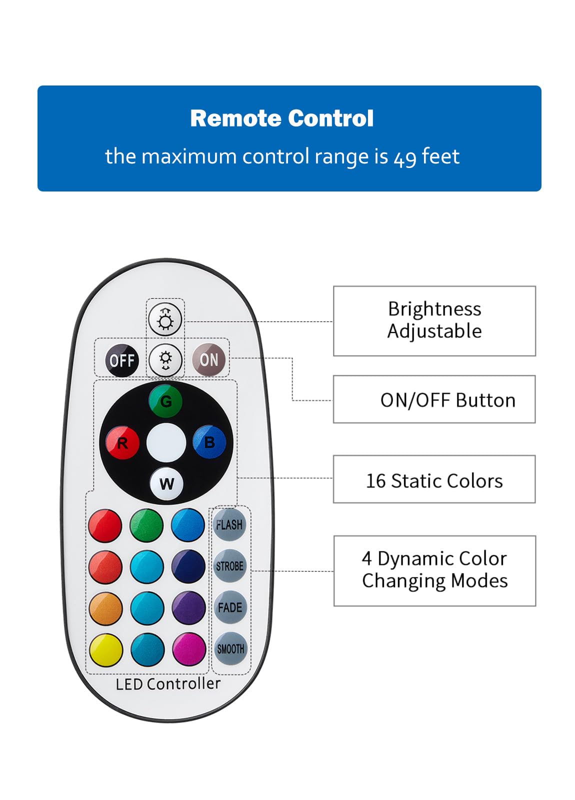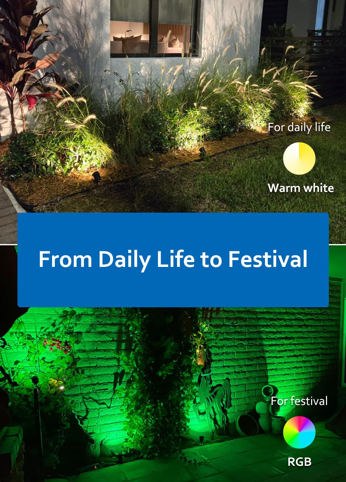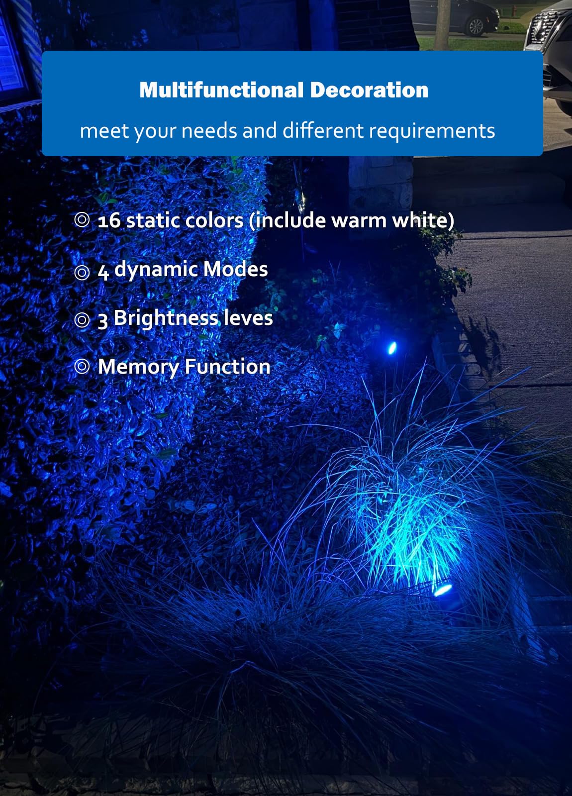 • RGBW Spot Lights Outdoor with Remote Control: These RGBW spot lights outdoor come in 16 static colors include warm white, 4 dynamic color changing modes (flash, strobe, fade, smooth), and 3 brightness levels. You can easy to set it up to your favorite mode with RF remote control, and with the memory function, they can remeber the previous settings so you don’t need to repeat the settings every time you turn on the lights. These RGB lights are ideal for Halloween Christmas or other holidays, and the included warm white color are also good for daily use.