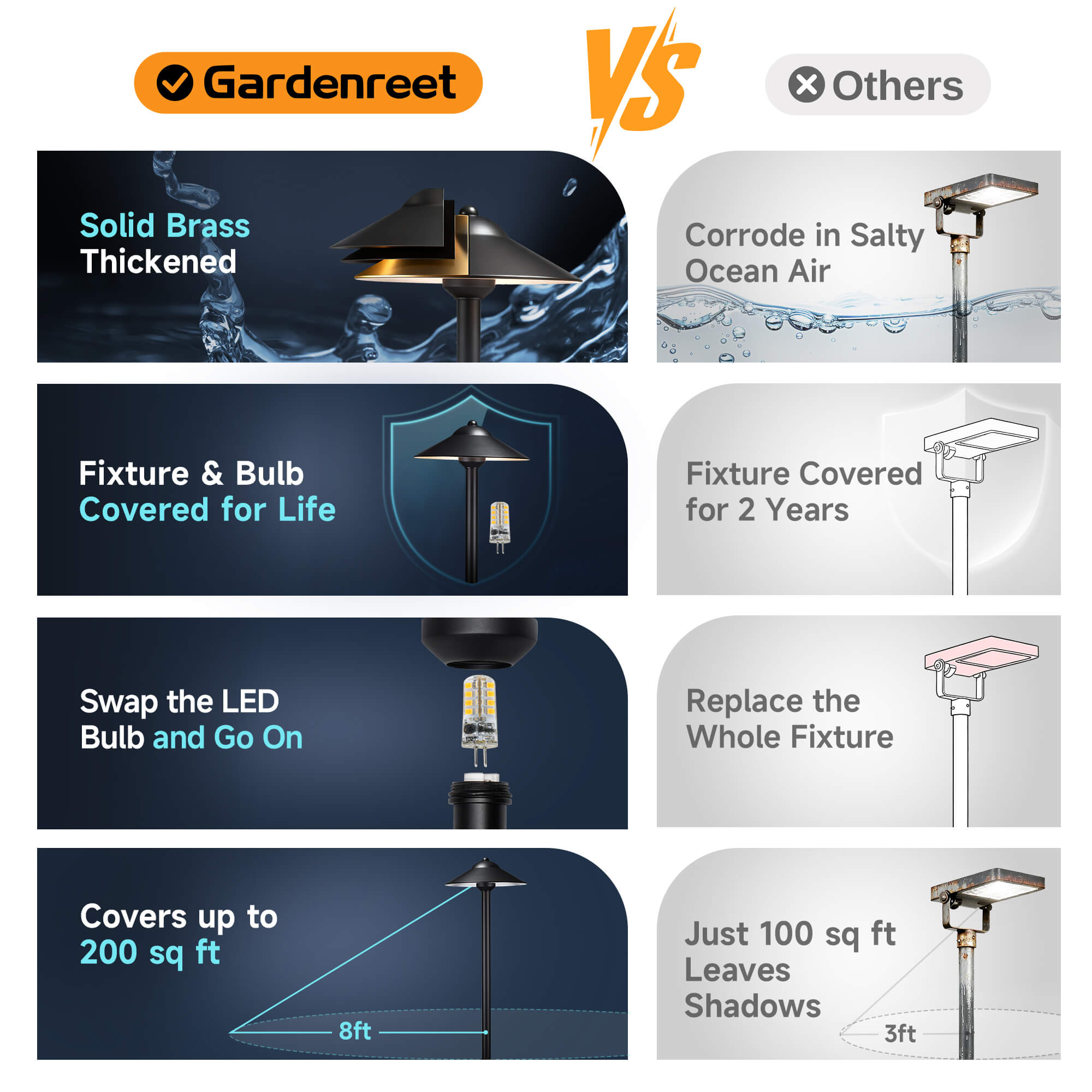 Gardenreet's brass LED landscape path lights are corrosion-resistant, ensuring long-lasting beauty. With replaceable bulbs, you won't need to replace the entire fixture. Plus, we offer a lifetime warranty for our brass outdoor path lights for yard. It's a durable investment that lasts for years!