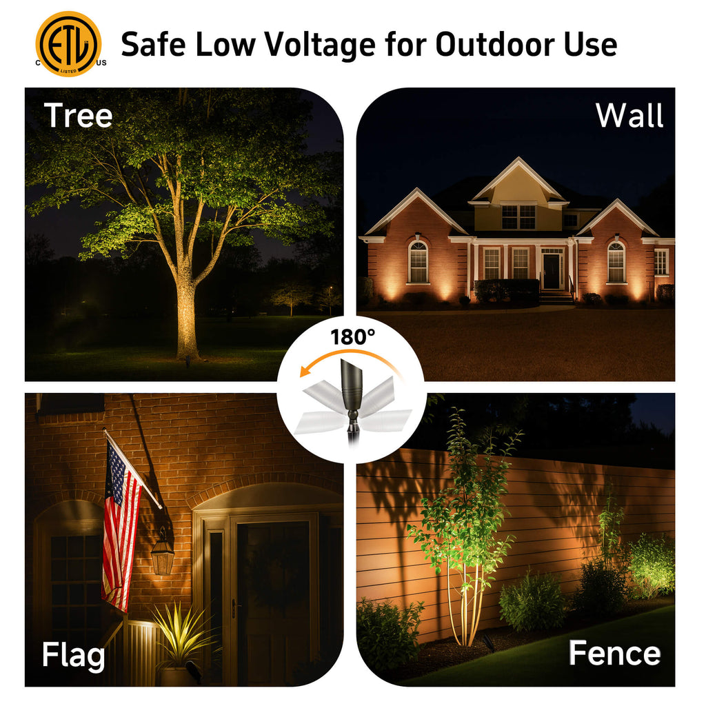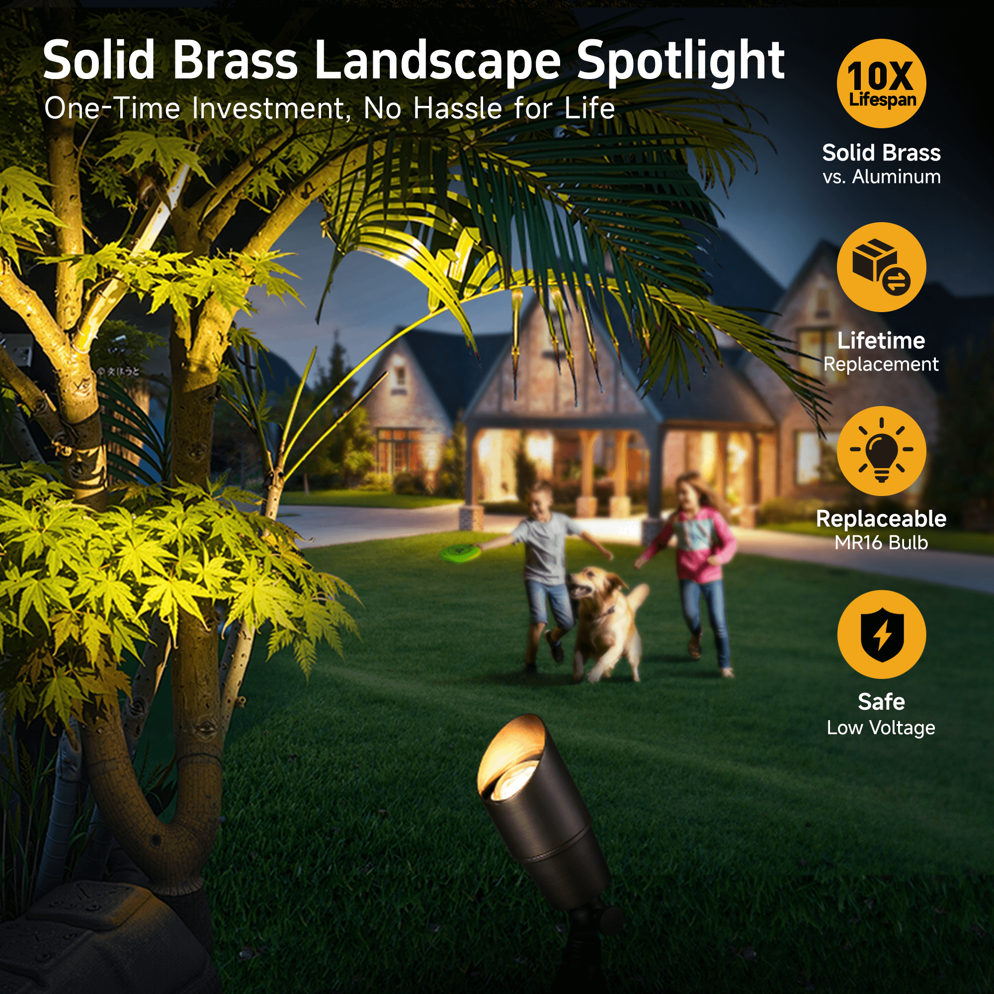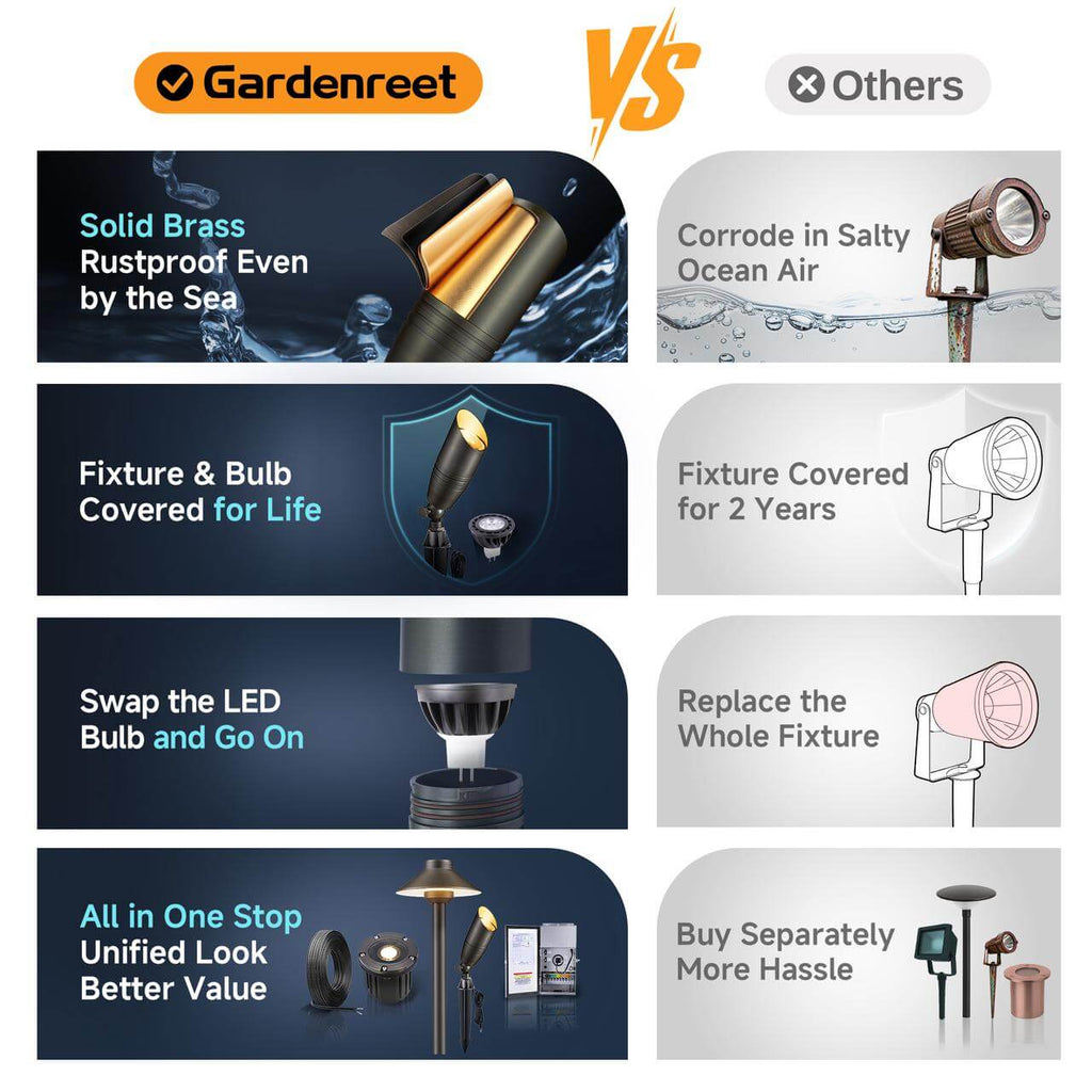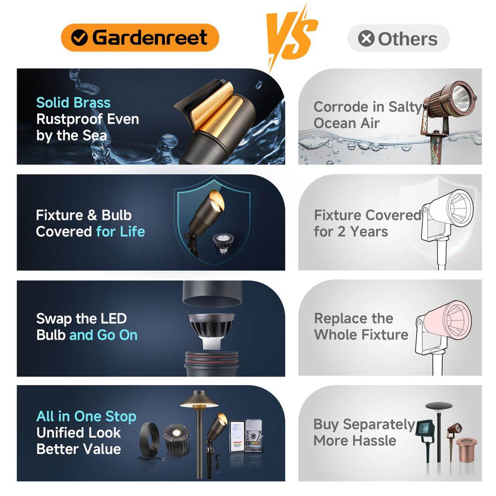 - Outstanding Service & Lifetime Warranty: Gardenreet is committed to providing a superior customer service experience. Our Brass Landscape Spotlights come with a lifetime warranty and an ETL safety certification. Please note a separate low voltage transformer is required. Dive into the world of superior landscape lighting with Gardenreet.Please get in touch with us if you have any issue.