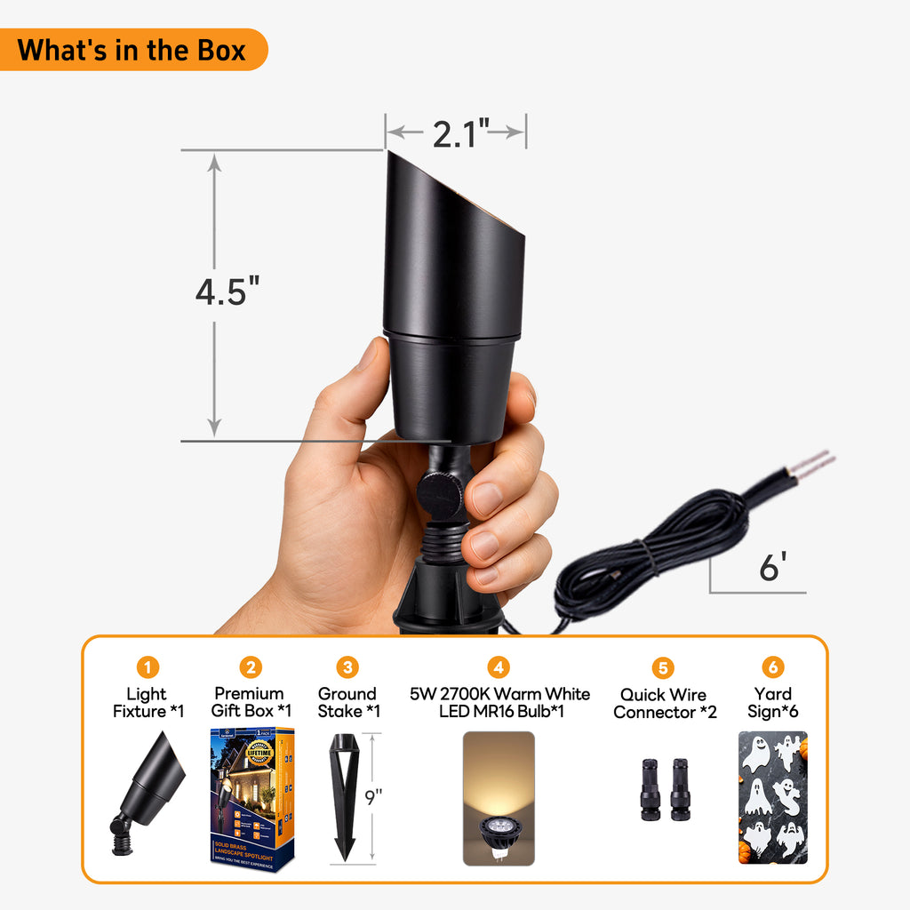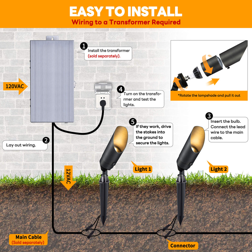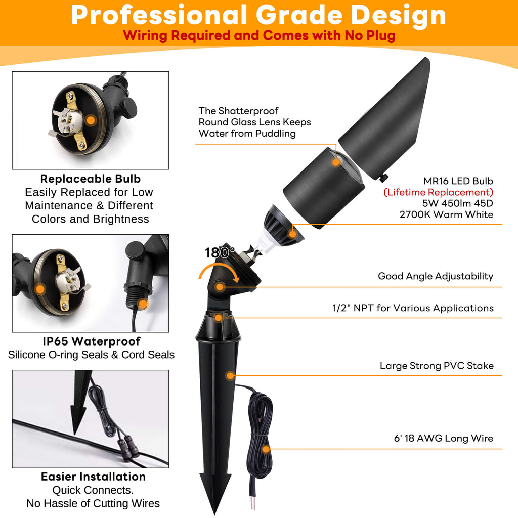 - Easy Installation & DIY Friendly: Outdoor uplights Including a 6ft lead wire, a durable PVC stake, and two free connectors per fixture, 12v landscape lights make installation a breeze. Replaceable MR16 bulbs base design allows you to DIY your favorite beam color and brightness, making them efficient and friendly for DIY enthusiasts and landscape professionals alike.