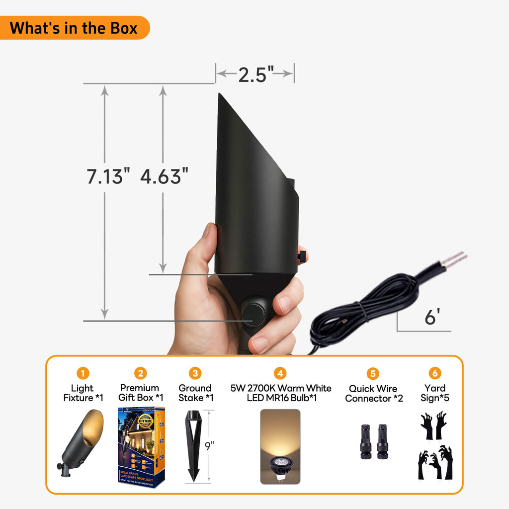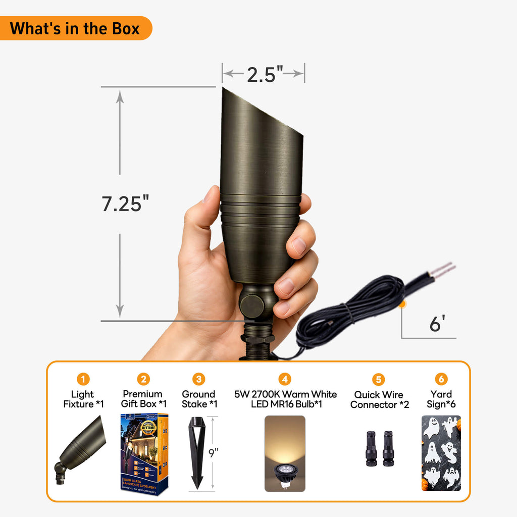 - Bulb: GU5.3 MR16(5W, 2700K warm white, 45° Beam Spread, 330 lumens, IP65 waterproof, 85.0 CRI, 50,000 hours average life)