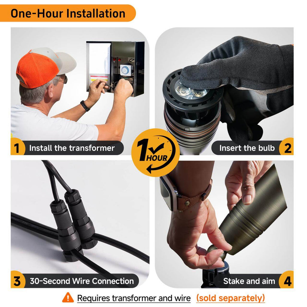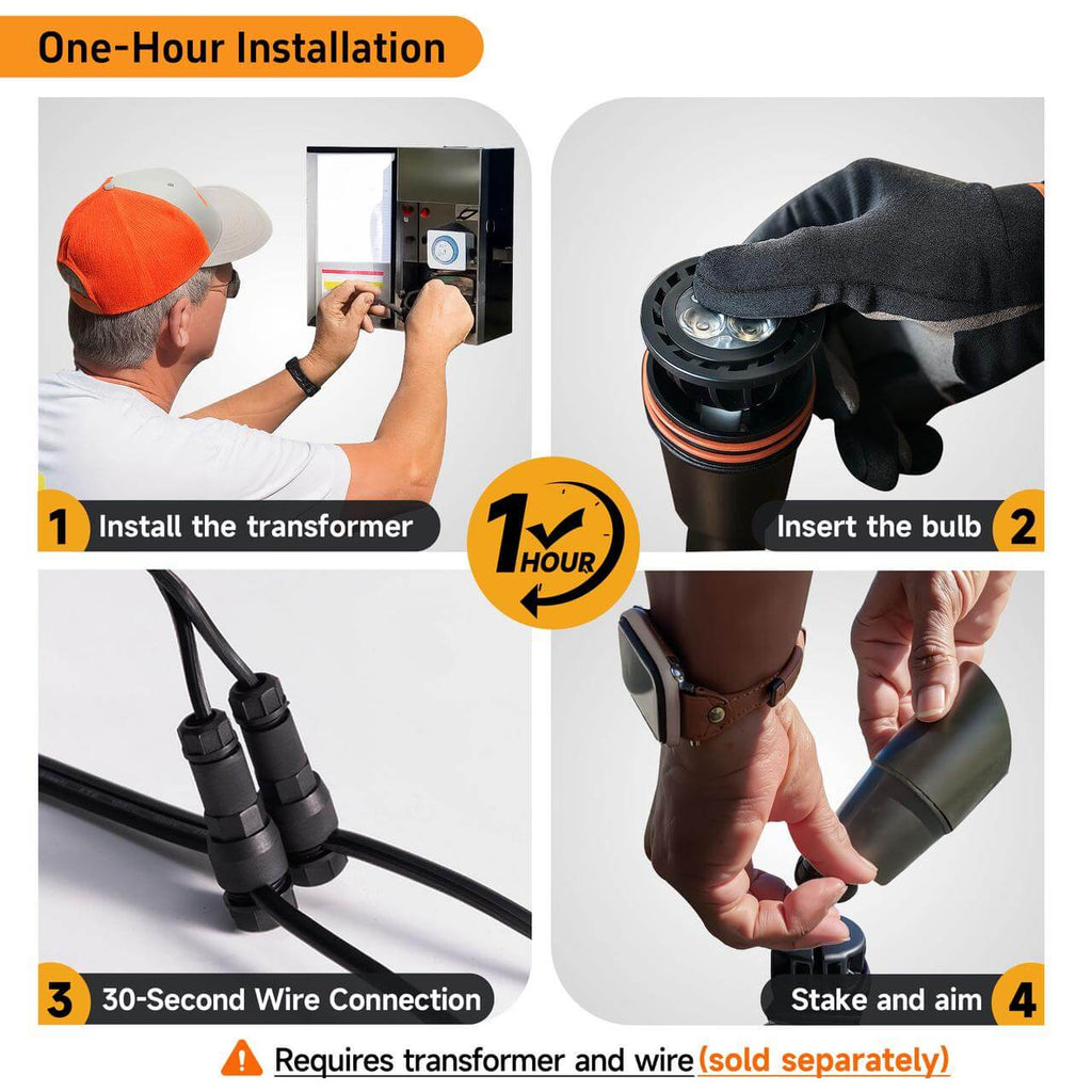 - Safety & Reliability: Built for the outdoors, this garden lights outdoor electric is IP65 waterproof and weather-resistant. Operating at 12v low voltage, providing consistent and reliable power independent of weather conditions or sunlight, it's a secure and reliable solution for your garden, driveway, patio, porch, and garage.