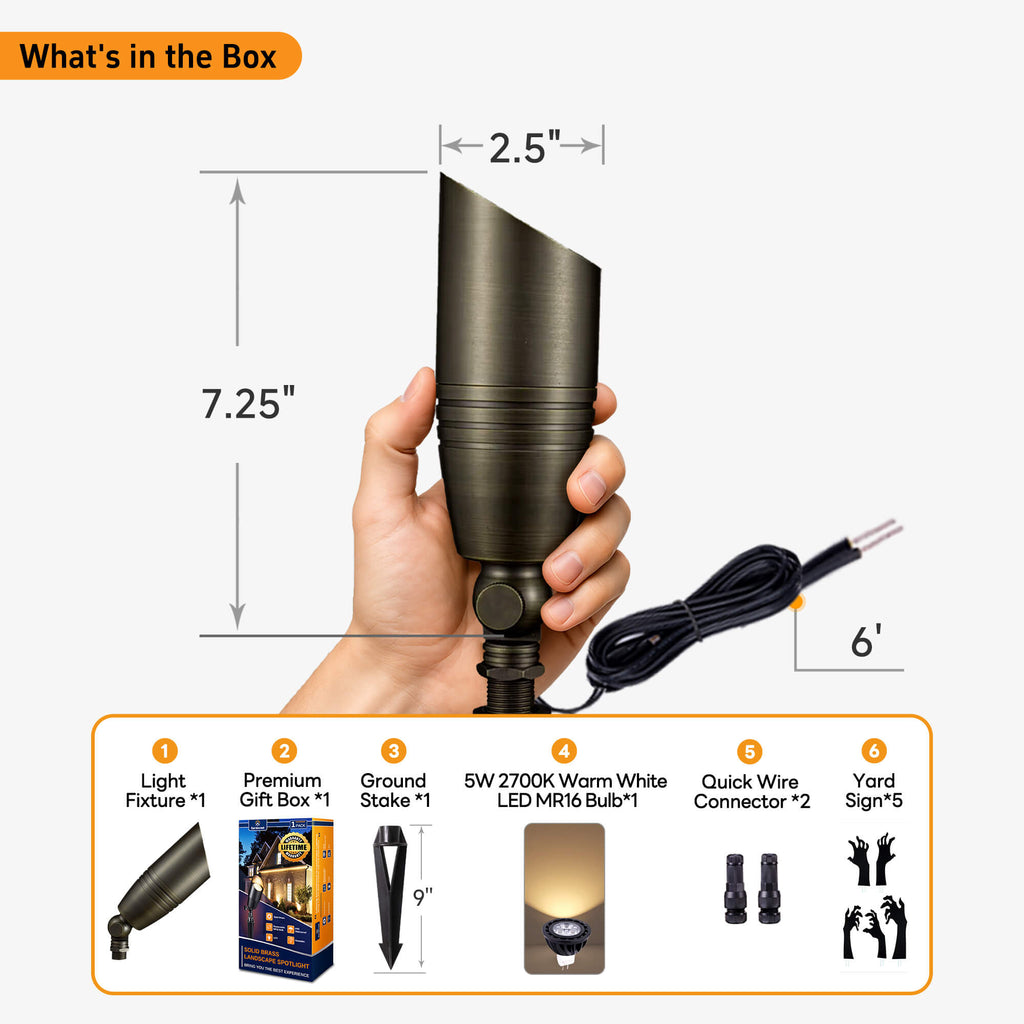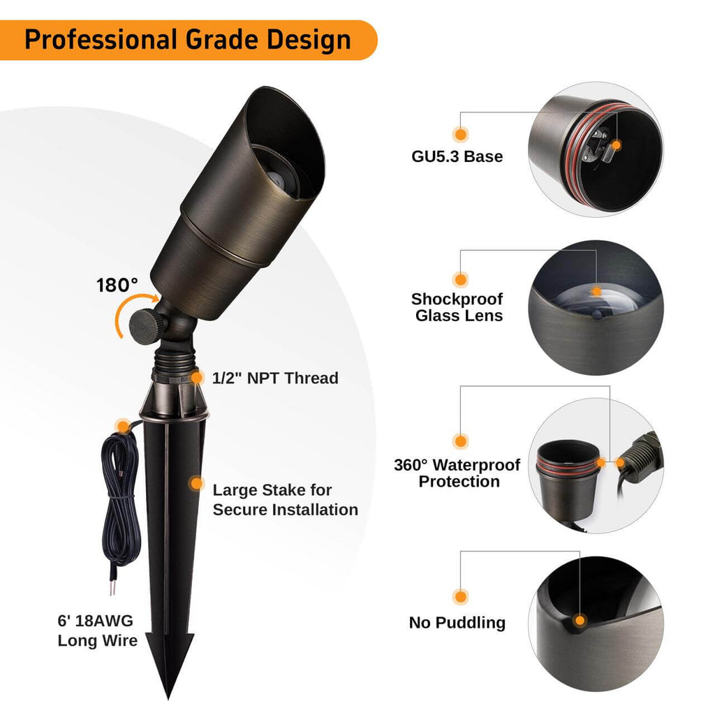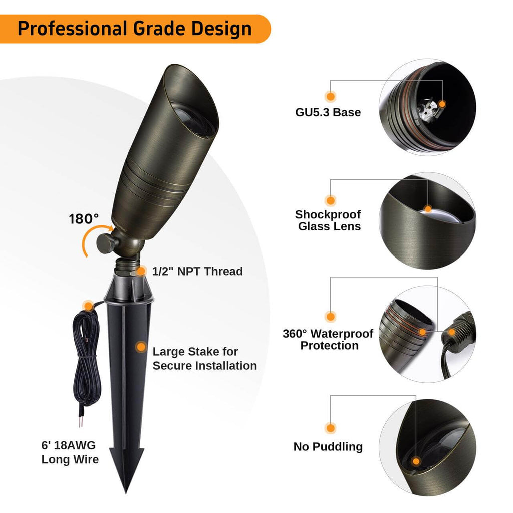 - Flexible Design & Wide Application: These Brass landscape lighting offer a 360° horizontal and 180° vertical rotation for optimal illumination and allows you to illuminate any angle you want, even without moving the fixture position. Garden spot lights provided uplight, flood, and spot lighting options allow for extensive coverage, accentuating your outdoor wall, pathway,driveway, trees, flags, and home