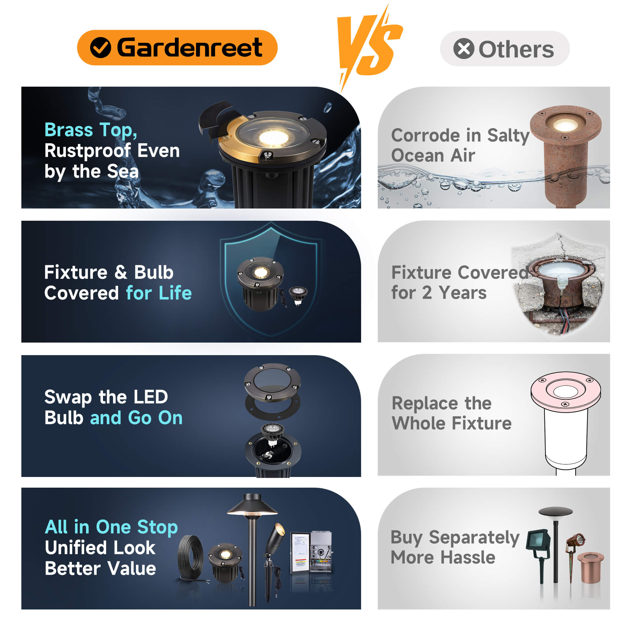 Gardenreet's brass LED landscape pond lights are corrosion-resistant, ensuring long-lasting beauty. With replaceable bulbs, you won't need to replace the entire fixture. Plus, we offer a lifetime warranty for our brass outdoor underwater lights. It's a durable investment that lasts for years!