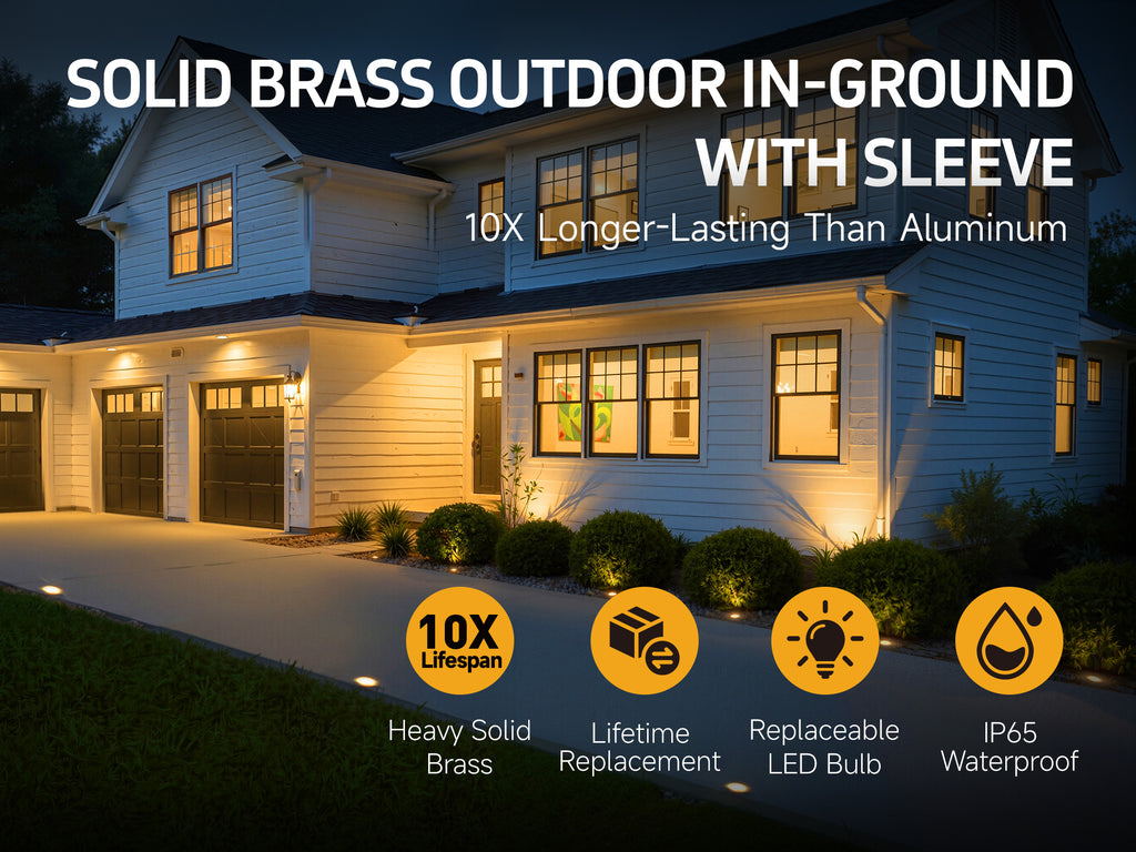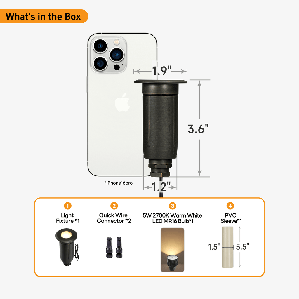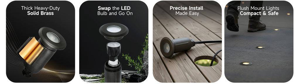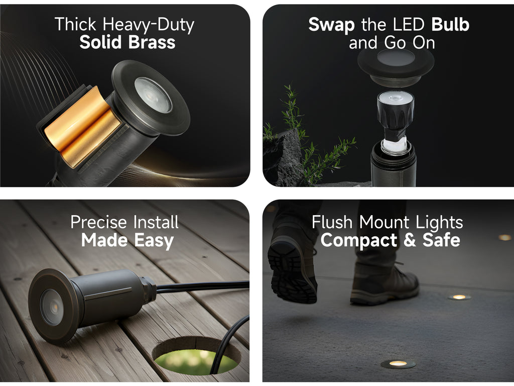 - 𝐂𝐨𝐦𝐩𝐚𝐜𝐭 & 𝐒𝐨𝐥𝐢𝐝 𝐁𝐫𝐚𝐬𝐬: Tired of replacing cheap, flimsy lights? Our Small well lights are forged from solid brass, deliver crush-proof & corrosion-proof. With an IP65 waterproof rating, they conquer any weather. This is your one-time, permanent investment in premium In Ground Landscape Lights for lifetime performance
