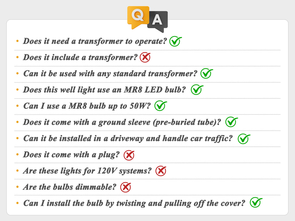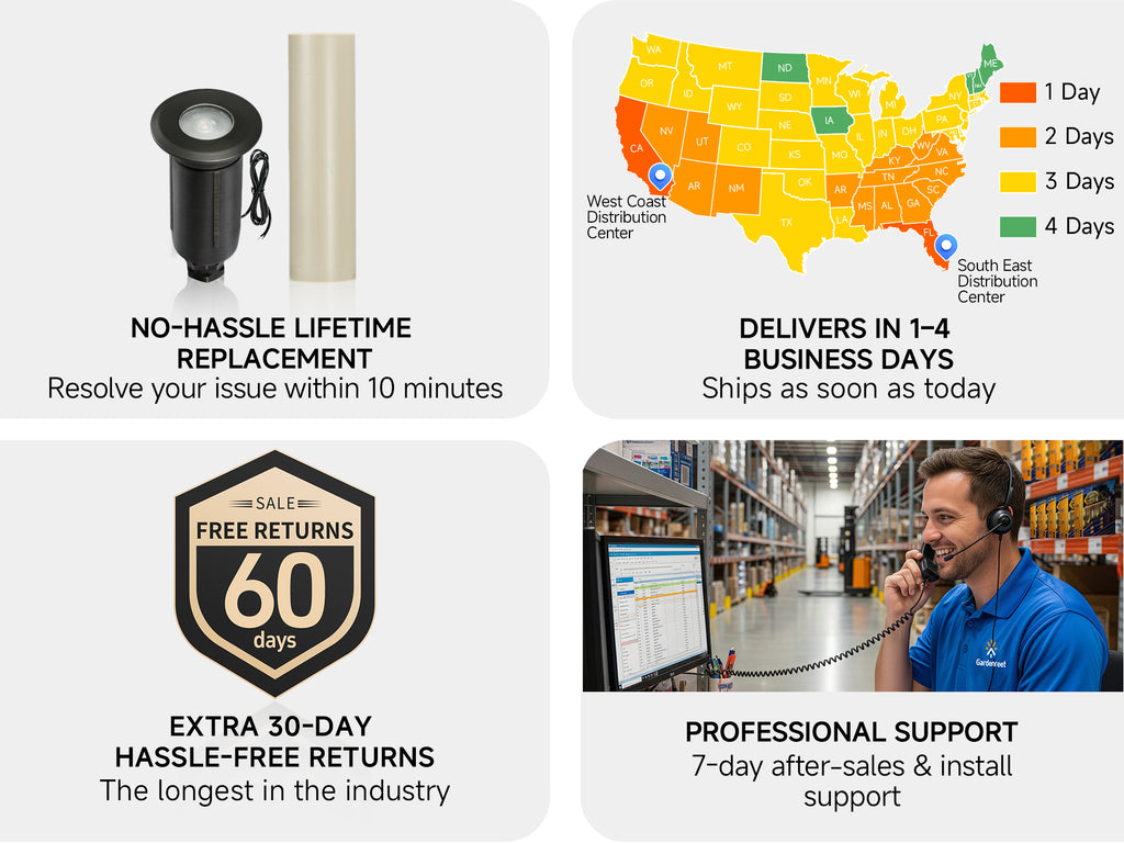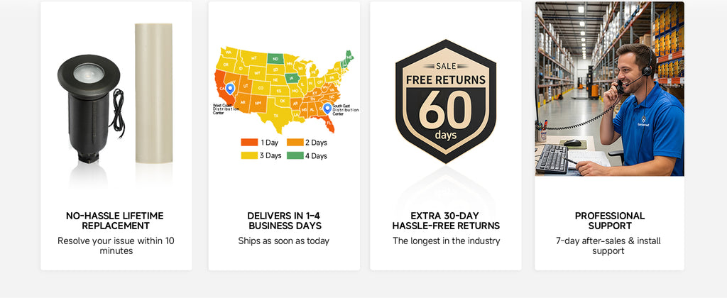 These low voltage landscape well lights come with a lifetime warranty. We provide free replacements for any fixture malfunctions.