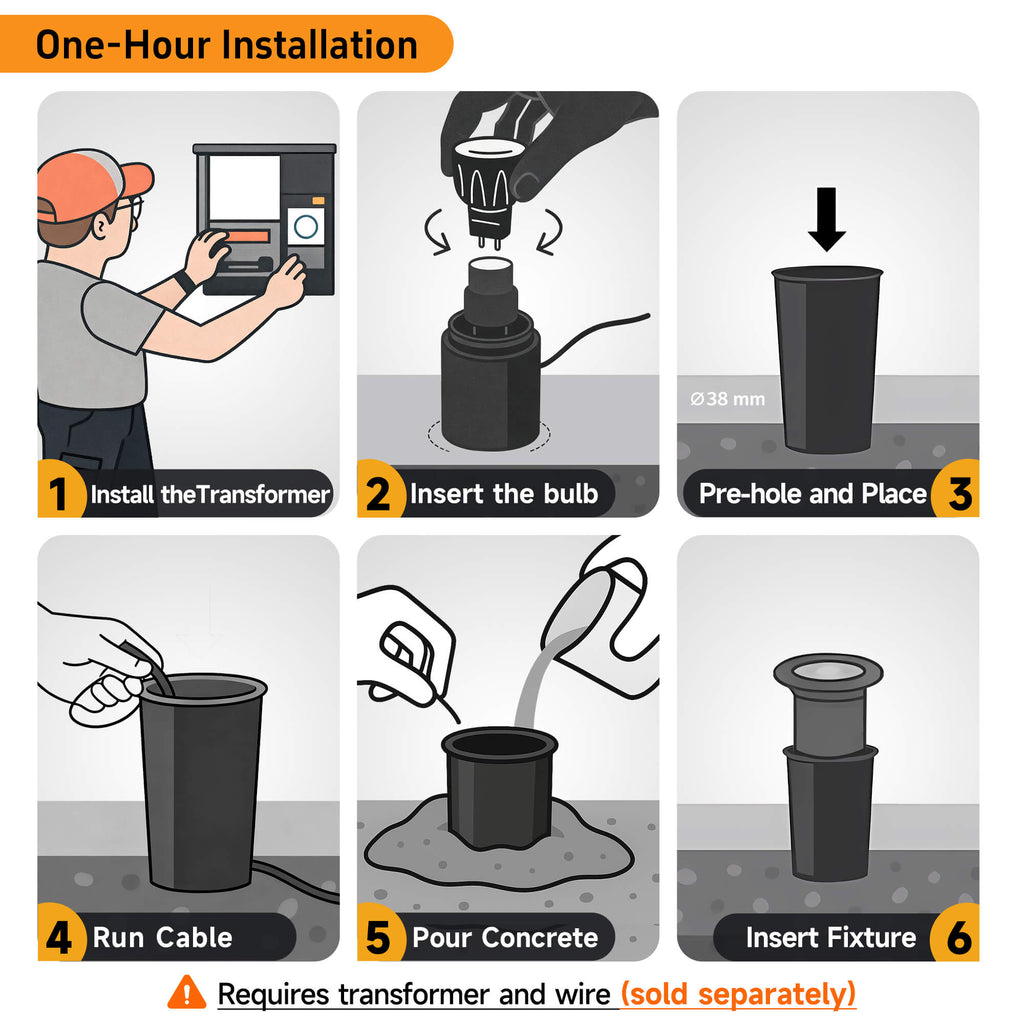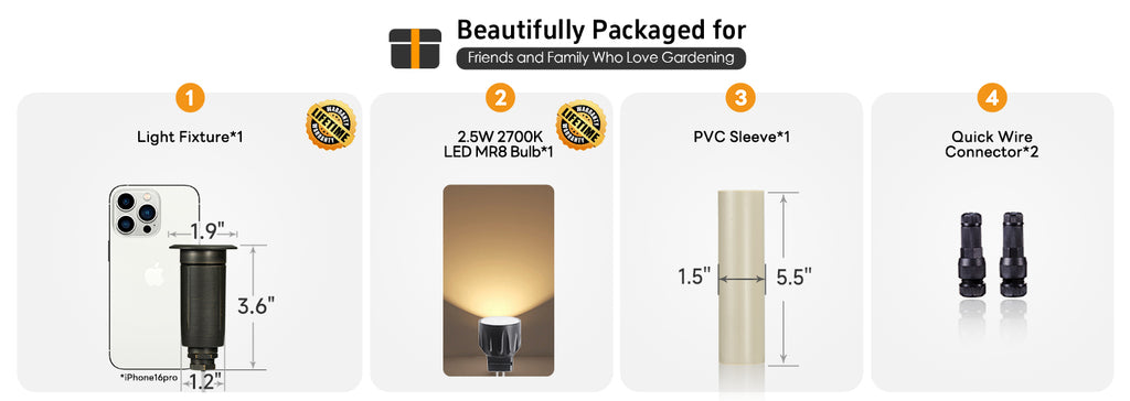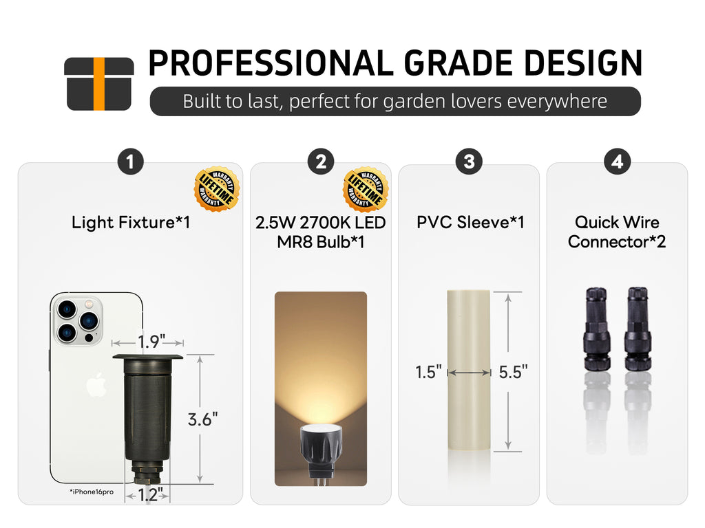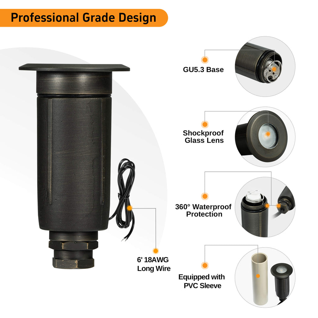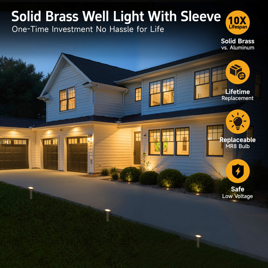- 𝐏𝐫𝐞𝐜𝐢𝐬𝐞 & 𝐖𝐨𝐫𝐫𝐲-𝐅𝐫𝐞𝐞 𝐈𝐧𝐬𝐭𝐚𝐥𝐥𝐚𝐭𝐢𝐨𝐧: Includes a PVC sleeve for a rock-solid installation in concrete, pavers, or gravel. This housing shields your Landscape Well Lights from ground pressure and moisture, while allowing for incredibly easy maintenance and MR8 bulb changes, ensuring true longevity