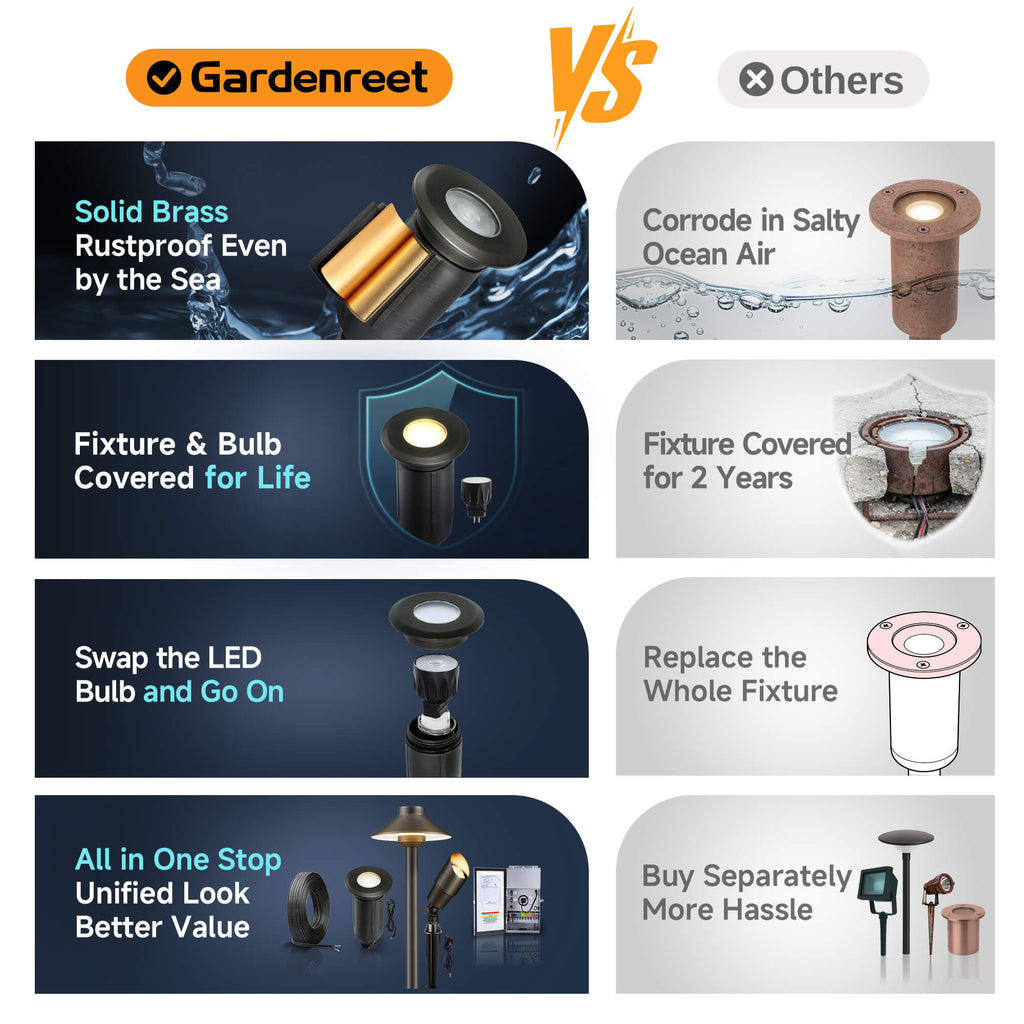 Gardenreet's brass in ground well lights are corrosion-resistant, ensuring long-lasting beauty. With replaceable bulbs, you won't need to replace the entire fixture. Plus, we offer a lifetime warranty for our brass led well lights. It's a durable investment that lasts for years!