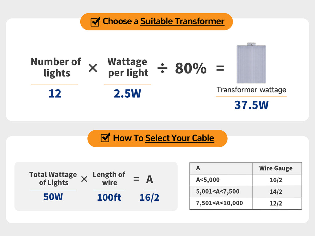 We recommend that the total wattage of the connected lights shall not exceed 80% of the transformer's power rating. For example, if connecting 8 welllights, each with a 2.5W bulb, the transformer's power should be above 25W.