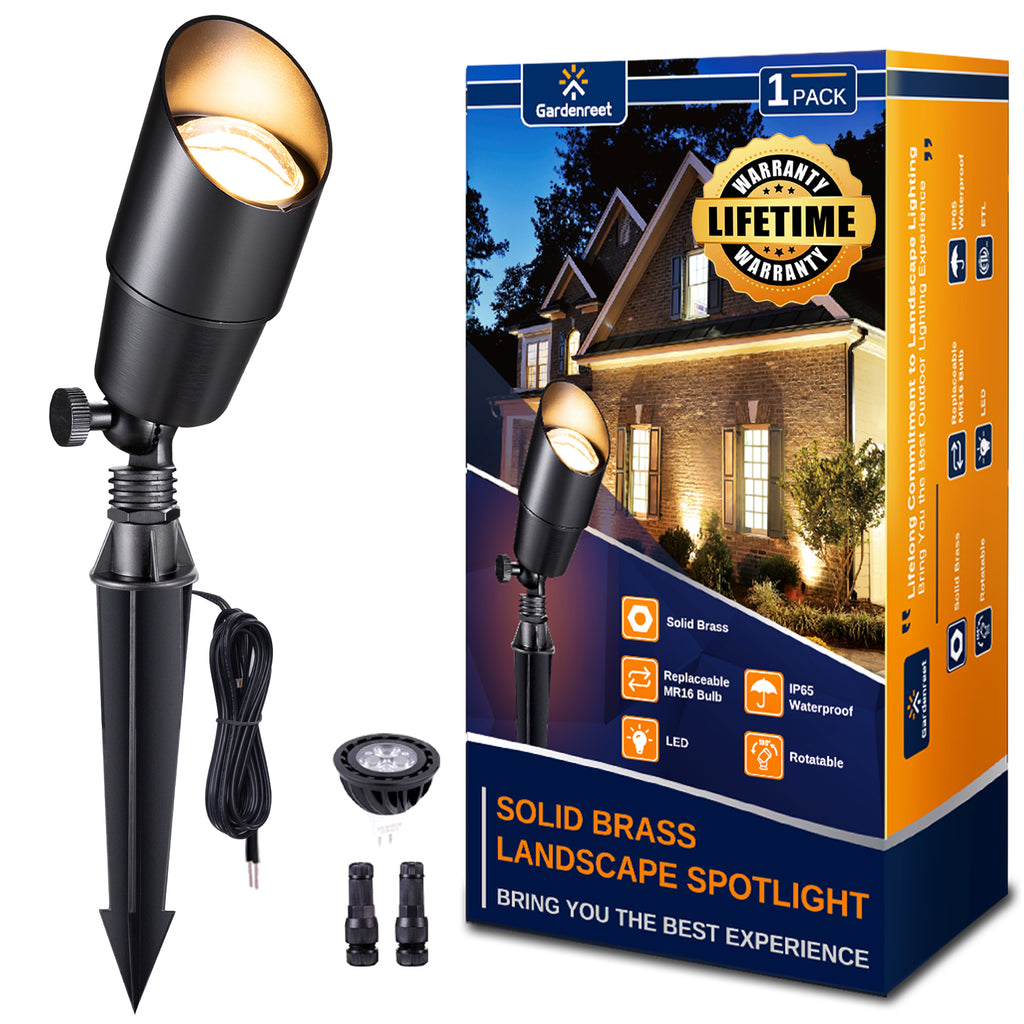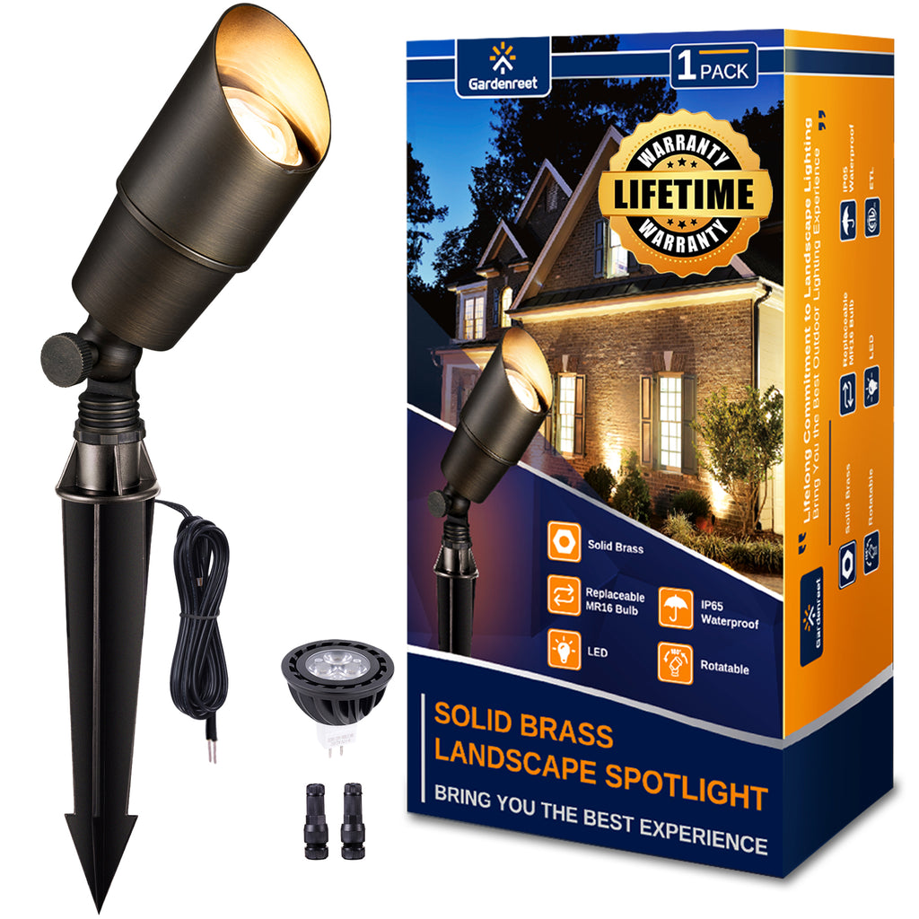 - Outstanding Service & Lifetime Warranty: Gardenreet is committed to providing a superior customer service experience. Our Brass Landscape Spotlights come with a lifetime warranty and an ETL safety certification. Please note a separate low voltage transformer is required. Dive into the world of superior landscape lighting with Gardenreet.Please get in touch with us if you have any issue.