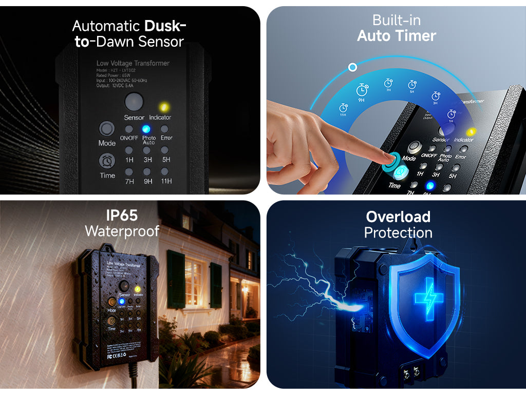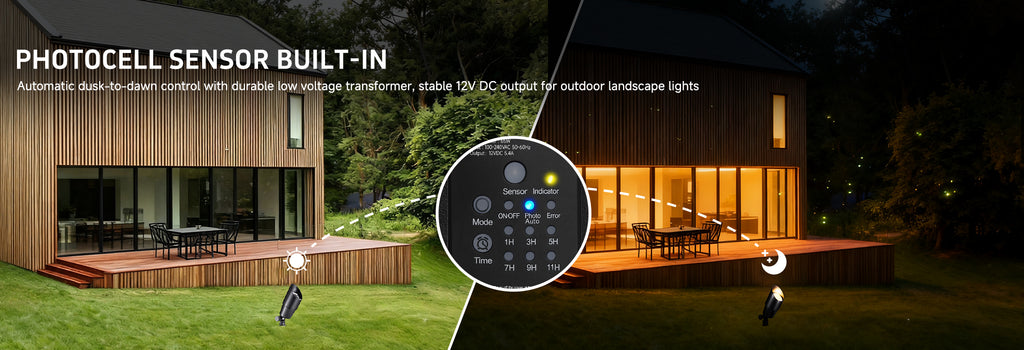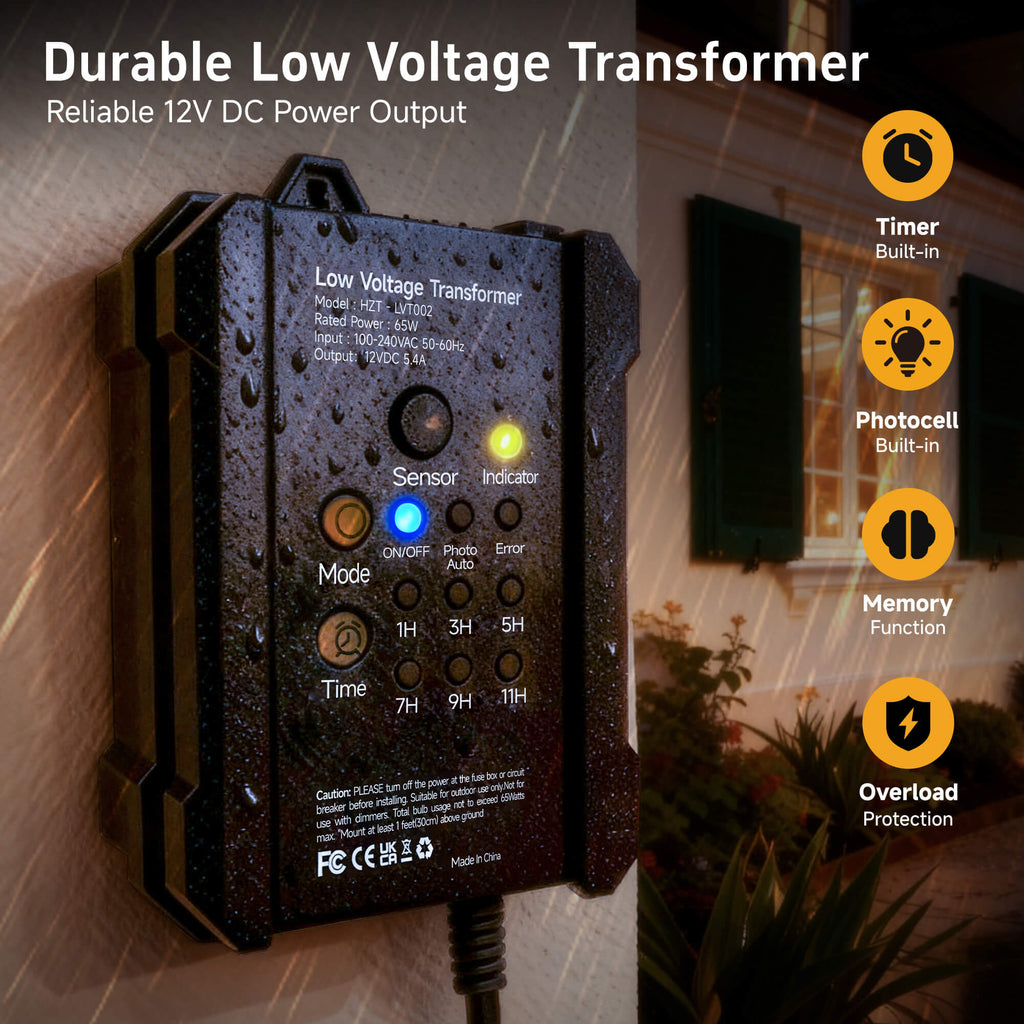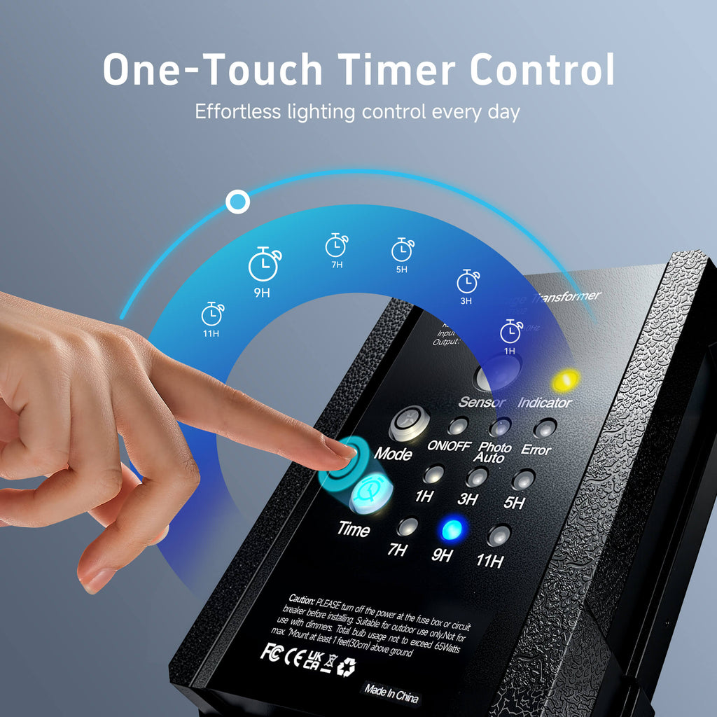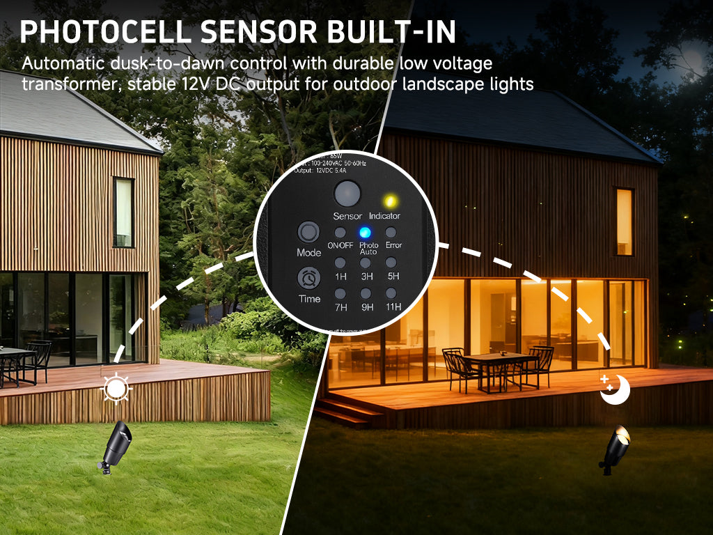 - 𝐃𝐔𝐒𝐊-𝐓𝐎-𝐃𝐀𝐖𝐍 𝐀𝐔𝐓𝐎𝐌𝐀𝐓𝐈𝐎𝐍: Automatically power your outdoor lights from dusk to dawn. This smart light transformer uses an integrated photocell light sensor for effortless ambiance in your landscape. A built-in 1-9 hour countdown timer provides total control and energy savings.
