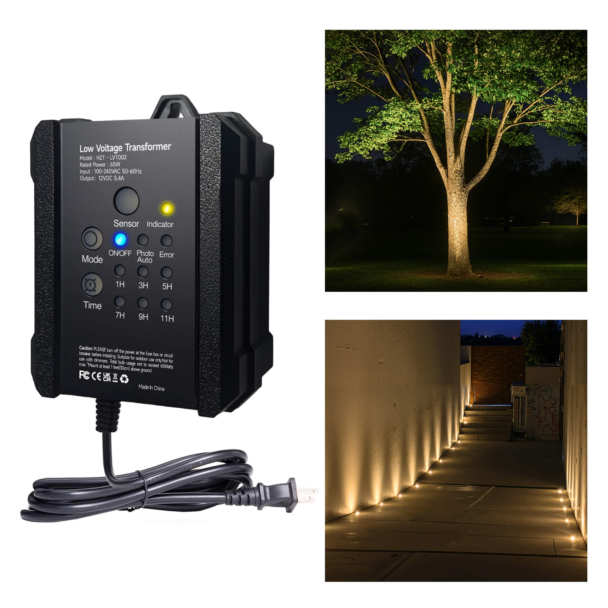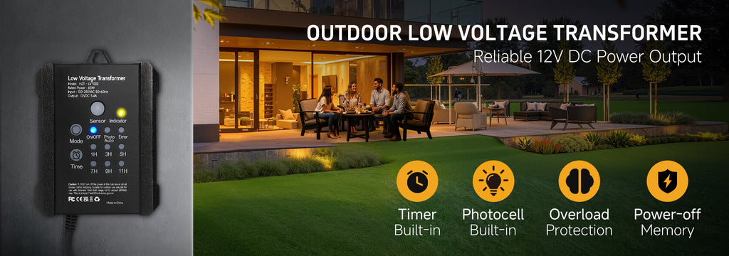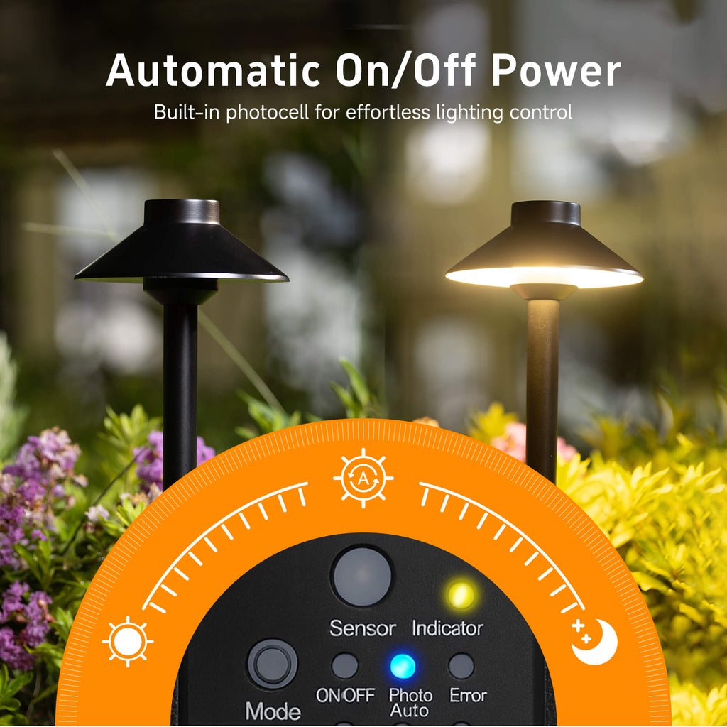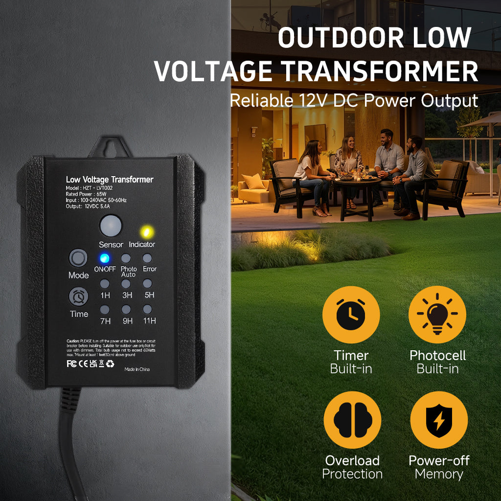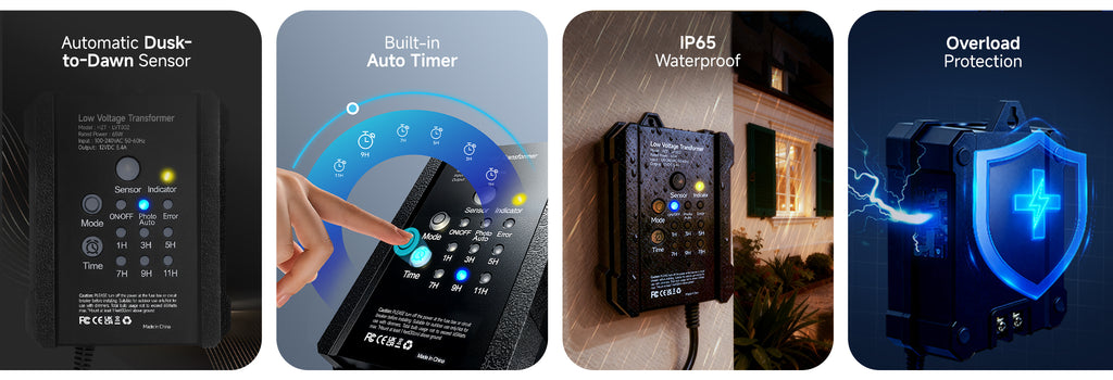 - 𝐃𝐔𝐒𝐊-𝐓𝐎-𝐃𝐀𝐖𝐍 𝐀𝐔𝐓𝐎𝐌𝐀𝐓𝐈𝐎𝐍: Automatically power your outdoor lights from dusk to dawn. This smart light transformer uses an integrated photocell light sensor for effortless ambiance in your landscape. A built-in 1-9 hour countdown timer provides total control and energy savings.