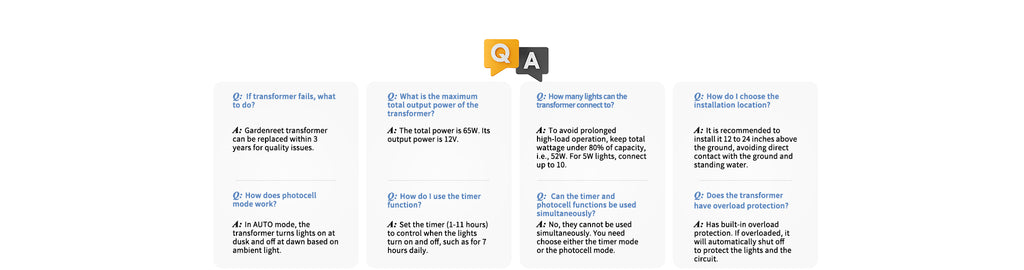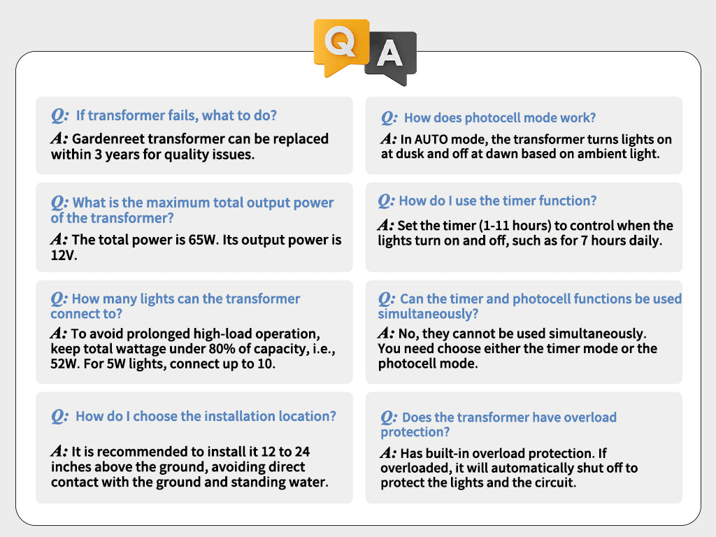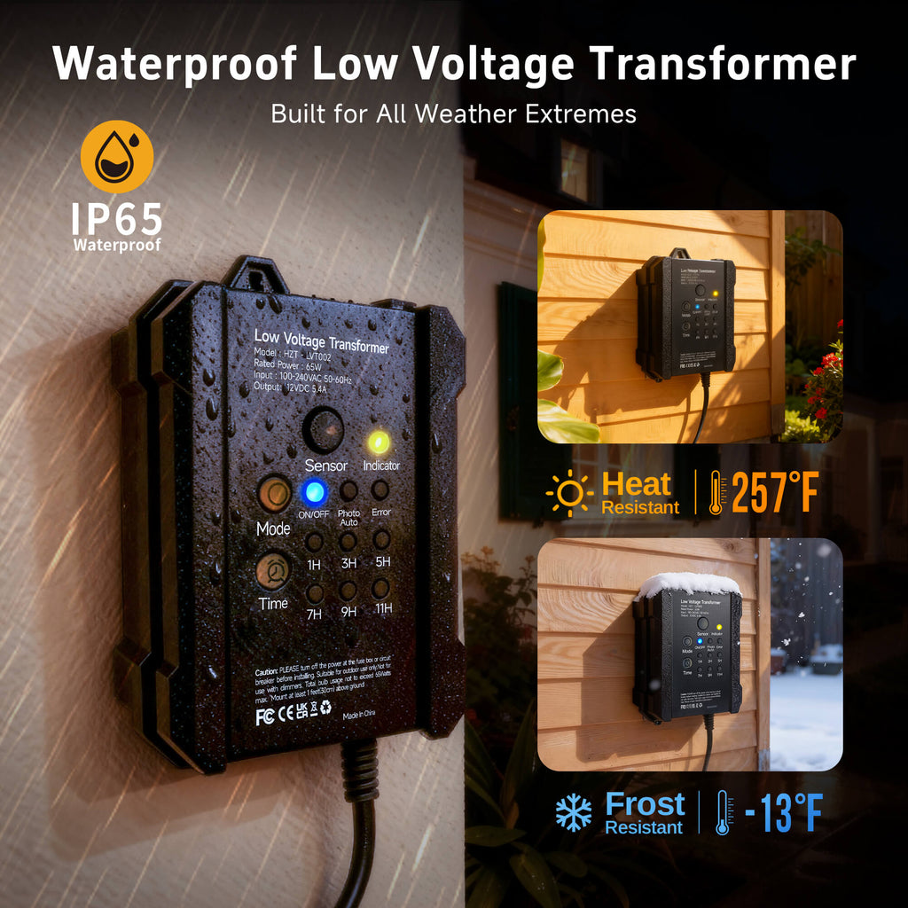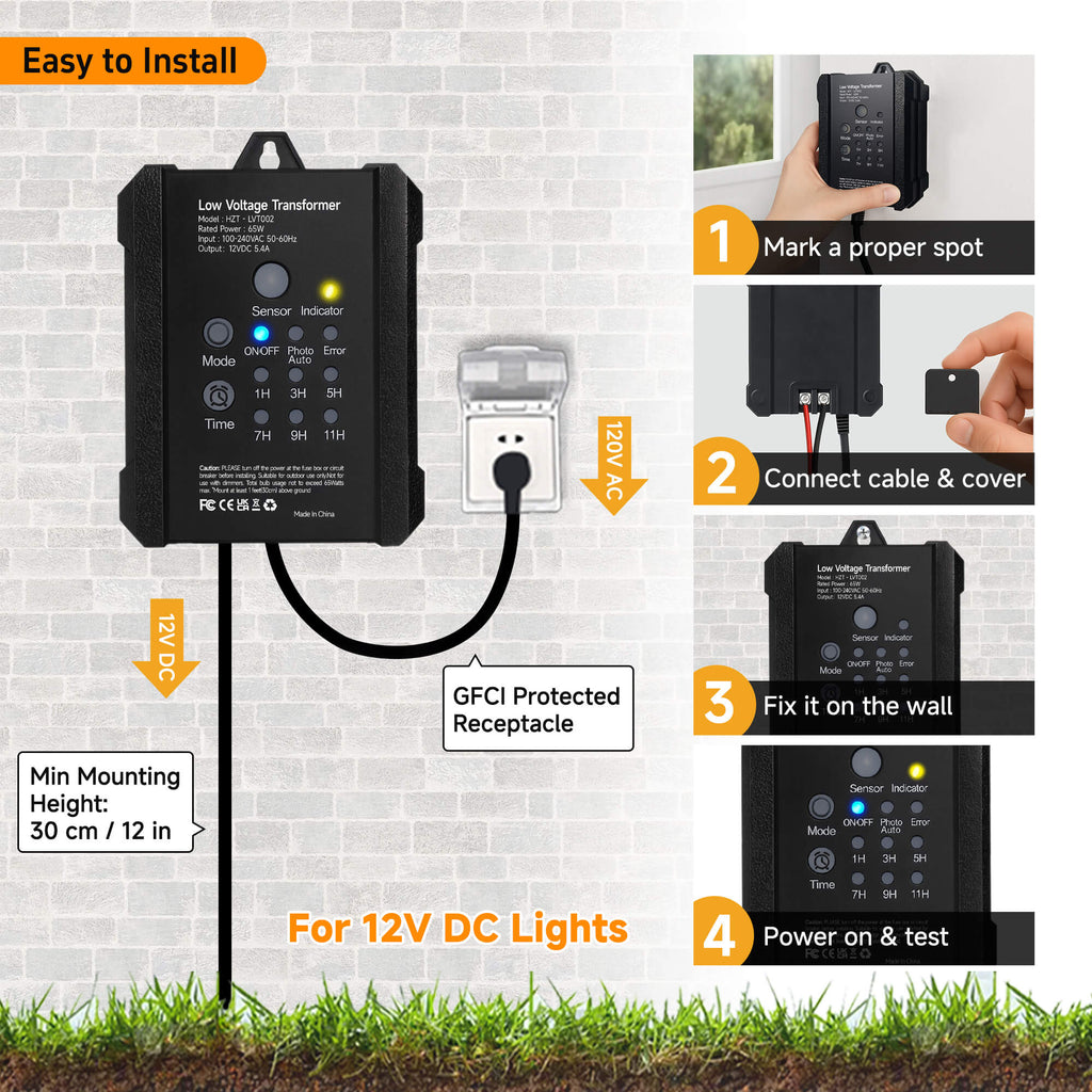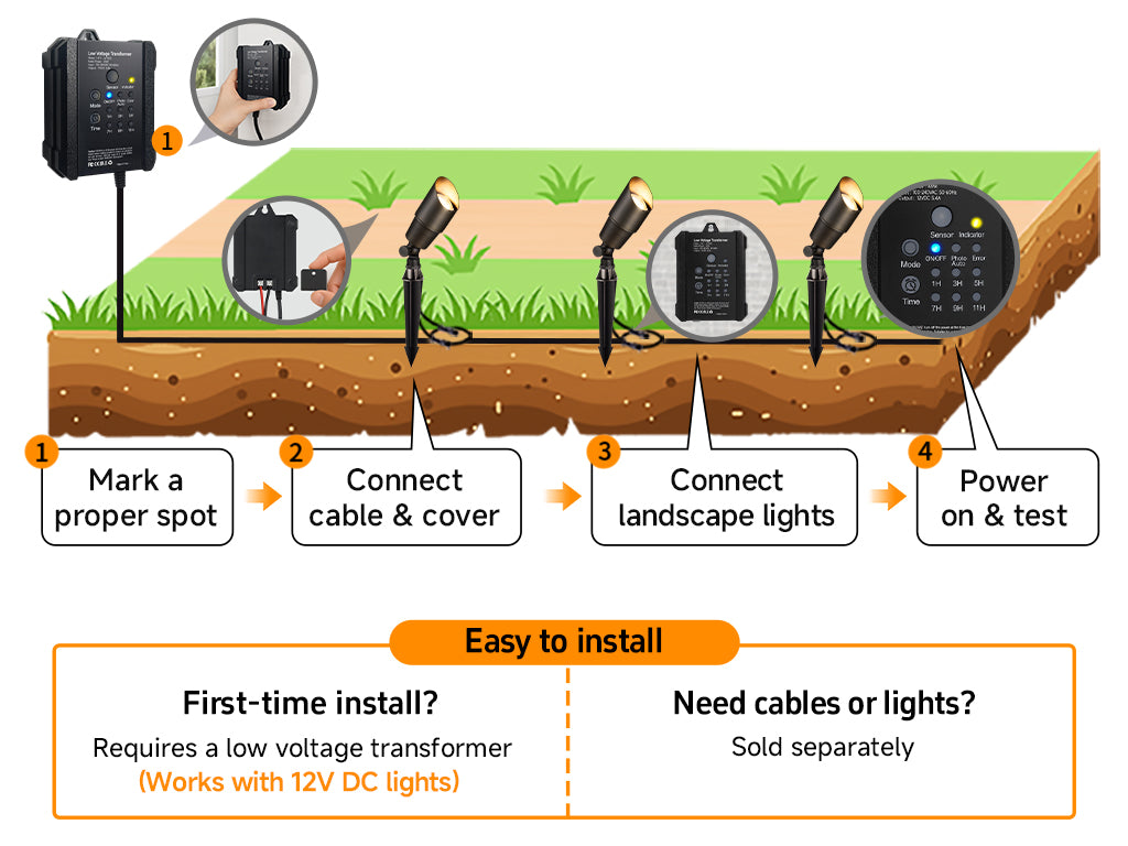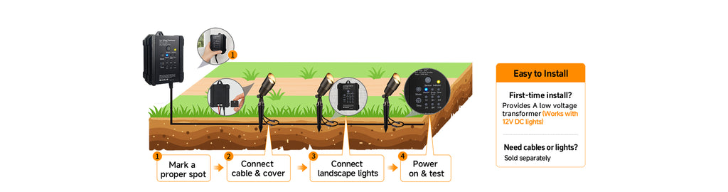 Yes, installation isDIY-friendly. Just connect your landscape lights to the transformer with low-voltage cable, plug it into a GFCI outlet, and you’re set.