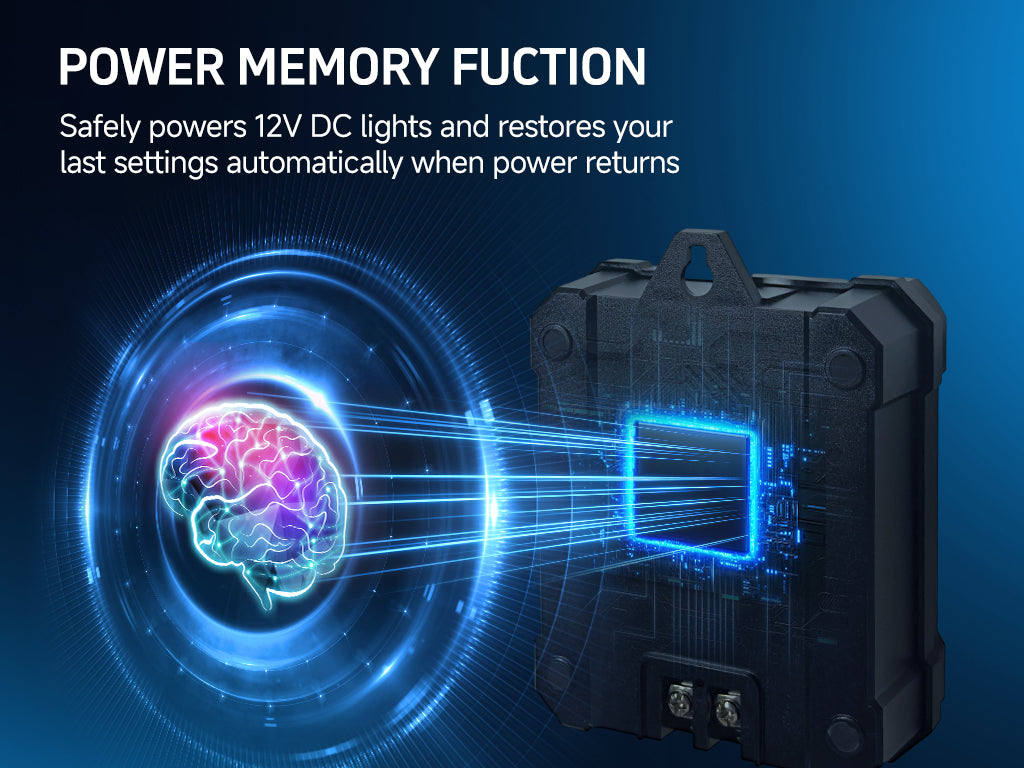 - Timer Options: 1–11 Hours, Dusk-to-Dawn, Always ON