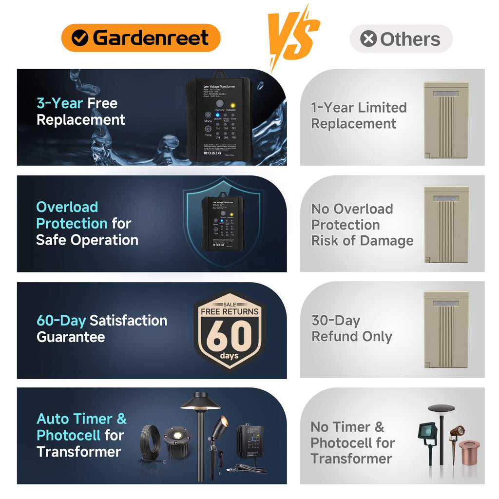 - 𝐒𝐀𝐅𝐄 & 𝐒𝐔𝐏𝐏𝐎𝐑𝐓𝐄𝐃: Peace of mind guaranteed. This transformer features built-in overload protection for a safe, simple low voltage installation. Plus, get expert brand support for your lighting project whenever you need it.